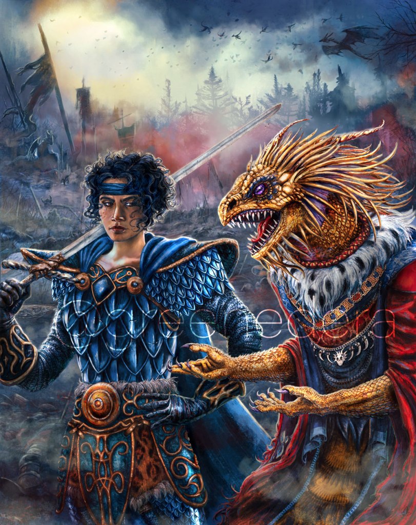 🗡🐲 Finally I can share a painting I was keeping under cover: “Kitiara Uth Matar and Myrtani the Aurak” – Dragonlance Fandom. The war is lost, the battlefield a disaster. Kitiara, dragonlord of the blue army, is giving a killing stare to her ally Myrtani the Aurak, currently ranting about the recent disaster. Commissioned as cover art for the upcoming DnD 5 manual by the Dragonlance Nexus “Champions of Krynn”