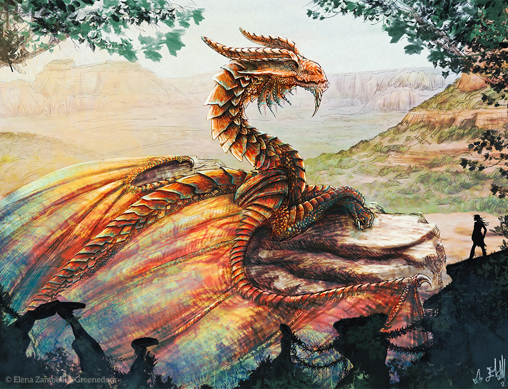 “The coppers have a proud ancestry, dating back to the matriarch Querrasian. The offspring of her first eggs included Blayze and Hyaniss, who mated to create the eggs of the next generation. The survivors of that clutch were Tharn and Sithtillaxx who, upon their flight from the grotto, grew to maturity and survived to become the procenitors of all copper dragons living today.” (from the Fift Age Dragons – manual)