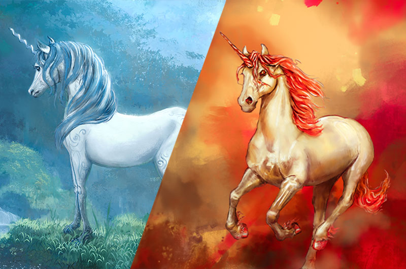 Dear readers, I present you two new unicorn paintings: a quiet one, and a fiery one.