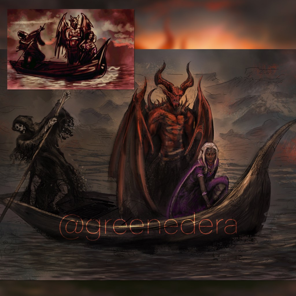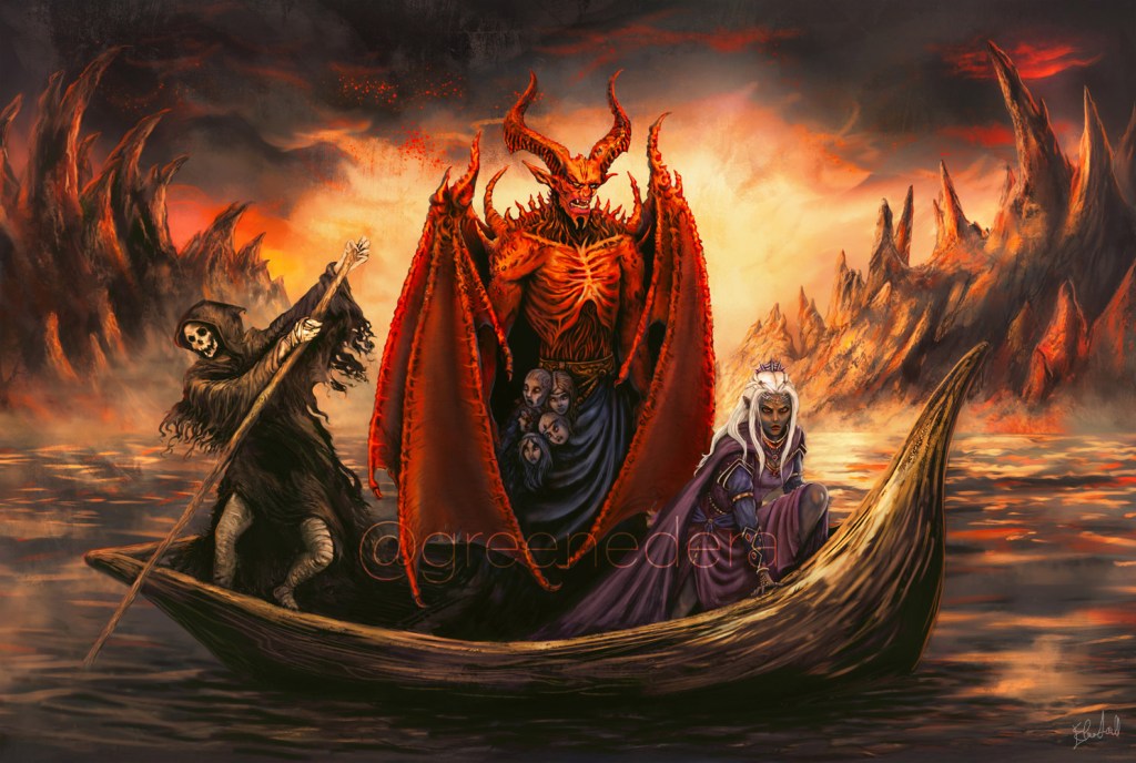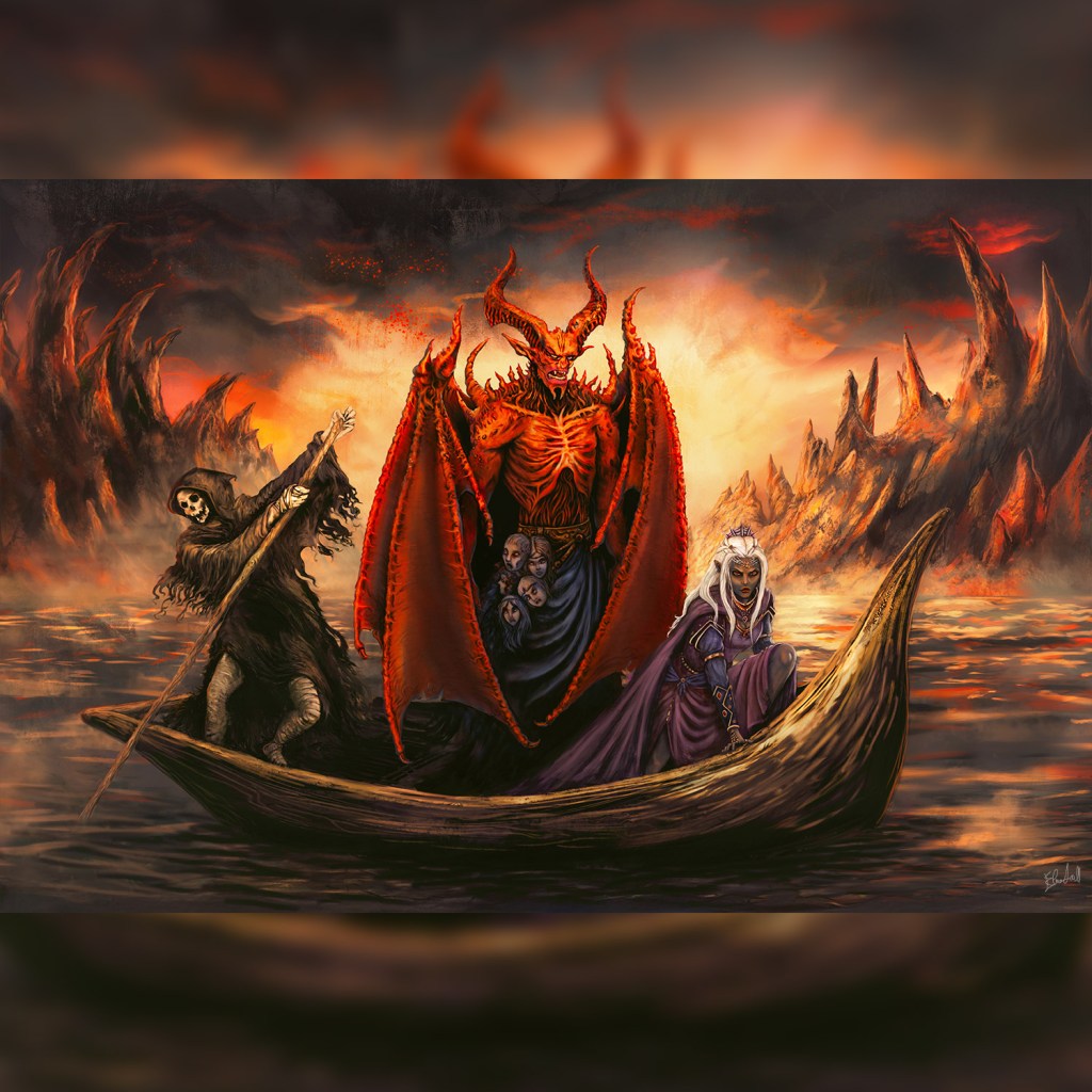“Travelers of Avernus,” my digital painting of a trio of characters crossing the Styx, the river of Avernus, in the Dungeons&Dragons universe. A commission for Winterhawk, for the 3rd book of the “Children of Hell” saga.