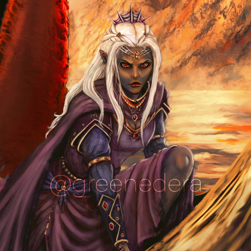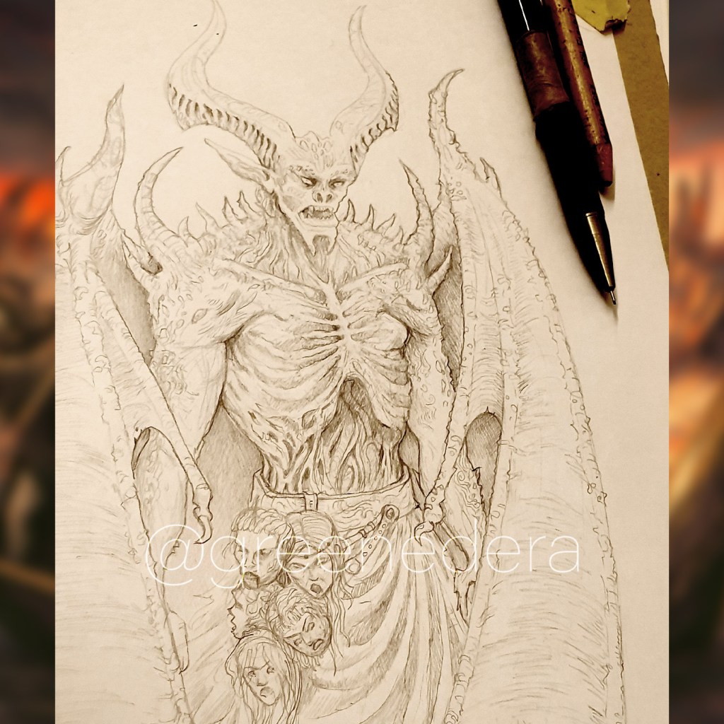 Fade stands at the bow of the small craft with a giant beside her. The diminutive drow elf looks up at her companion with a bit of wonder. He is a Huge Pit Fiend with wide wings tucked around his back to give her some room to see the ominous fortress coming into view upriver. His midsection is ripped open and hollow of organs. His ribs show in some places where a fallen angel struck him years ago leaving a wound that will not heal. He is Bel, Lord of the first plane of hell. Some call him the pretender because of his defeat of his former predecessor and lover, Zariel.