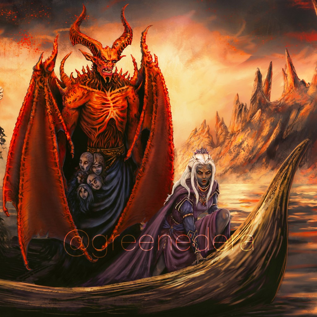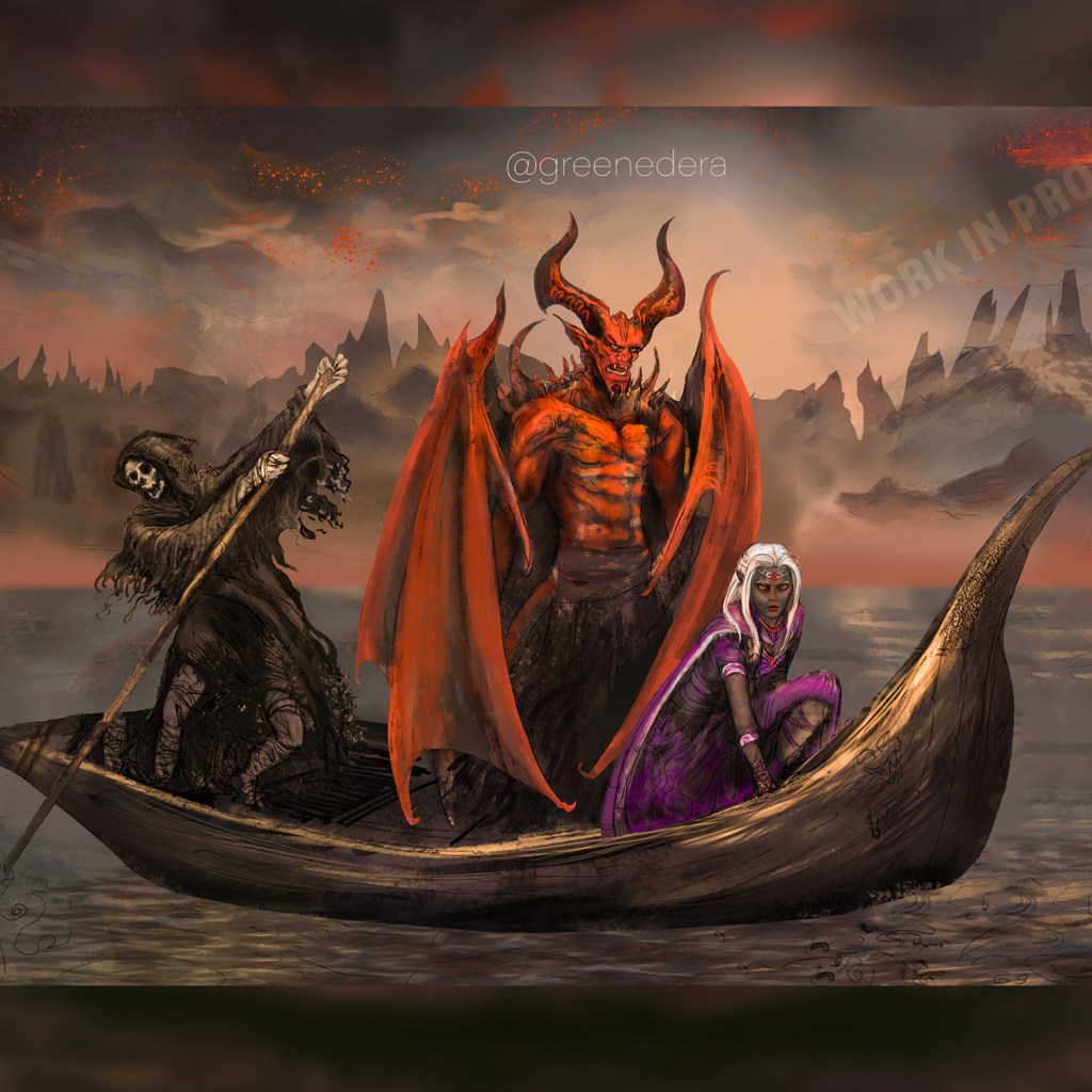 Bel, lord of Avernus and Fade, a drow matron, are crossing the river, while a skeletal boatman works the oar.