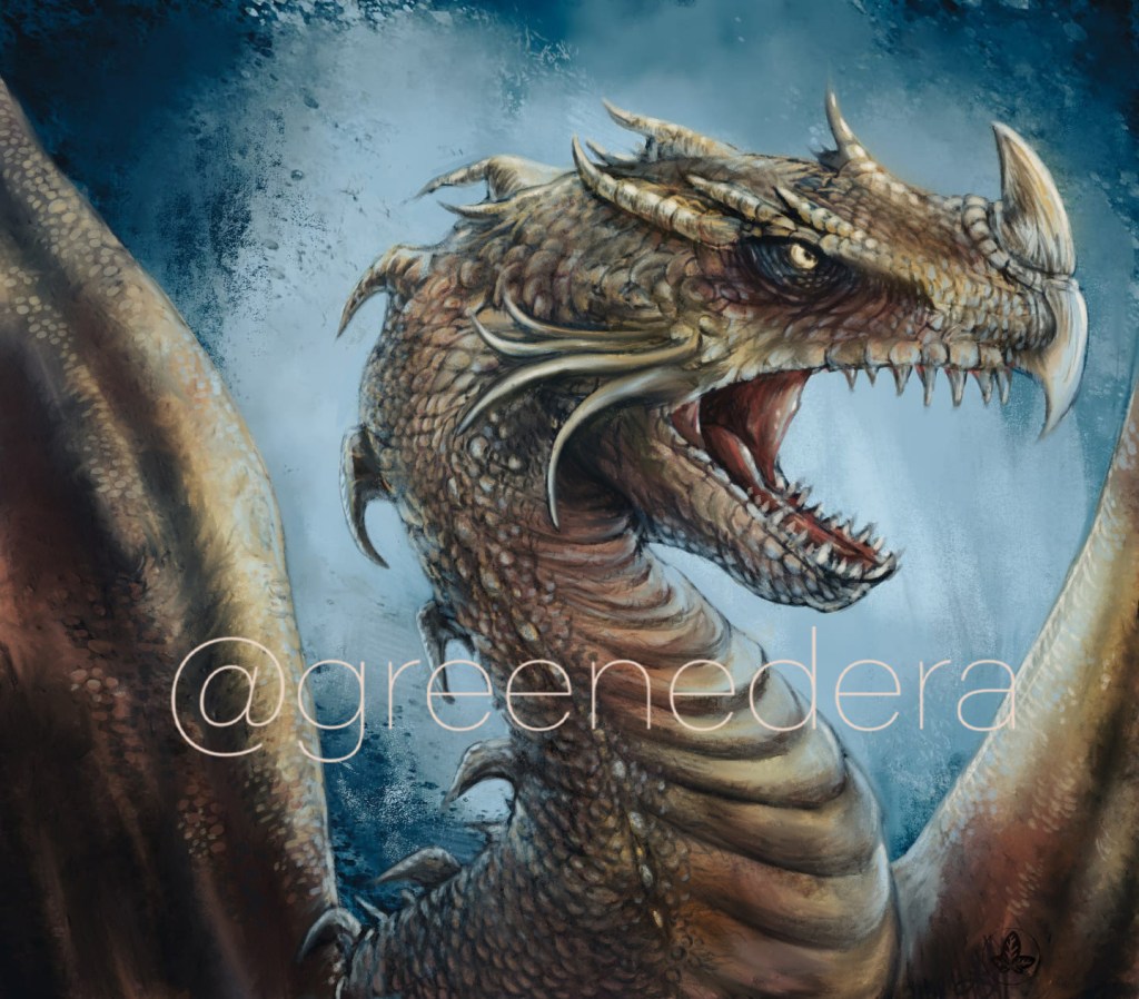 “Angry dragon” – A draft illustration (pencil, photoshop, Cintiq) painted on January 1, 2022 during the “Dragonary challenge,” remastered during 2023.