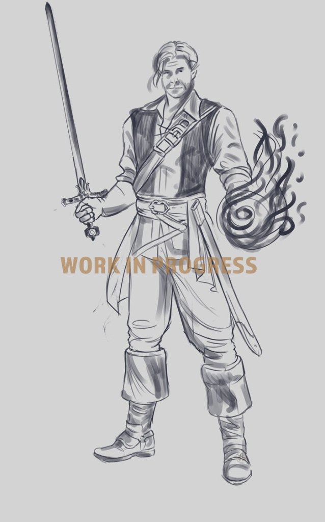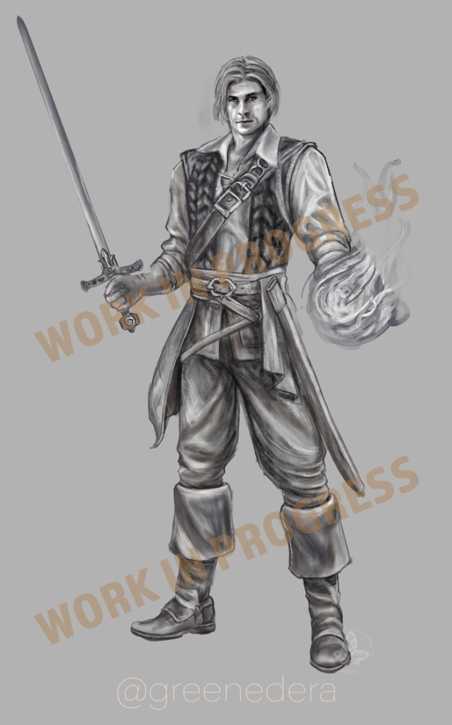 Commissioned portrait of a Dungeons&Dragons character, a wizard named Antony. He uses lightning magic and near him flies an Air Mephit.