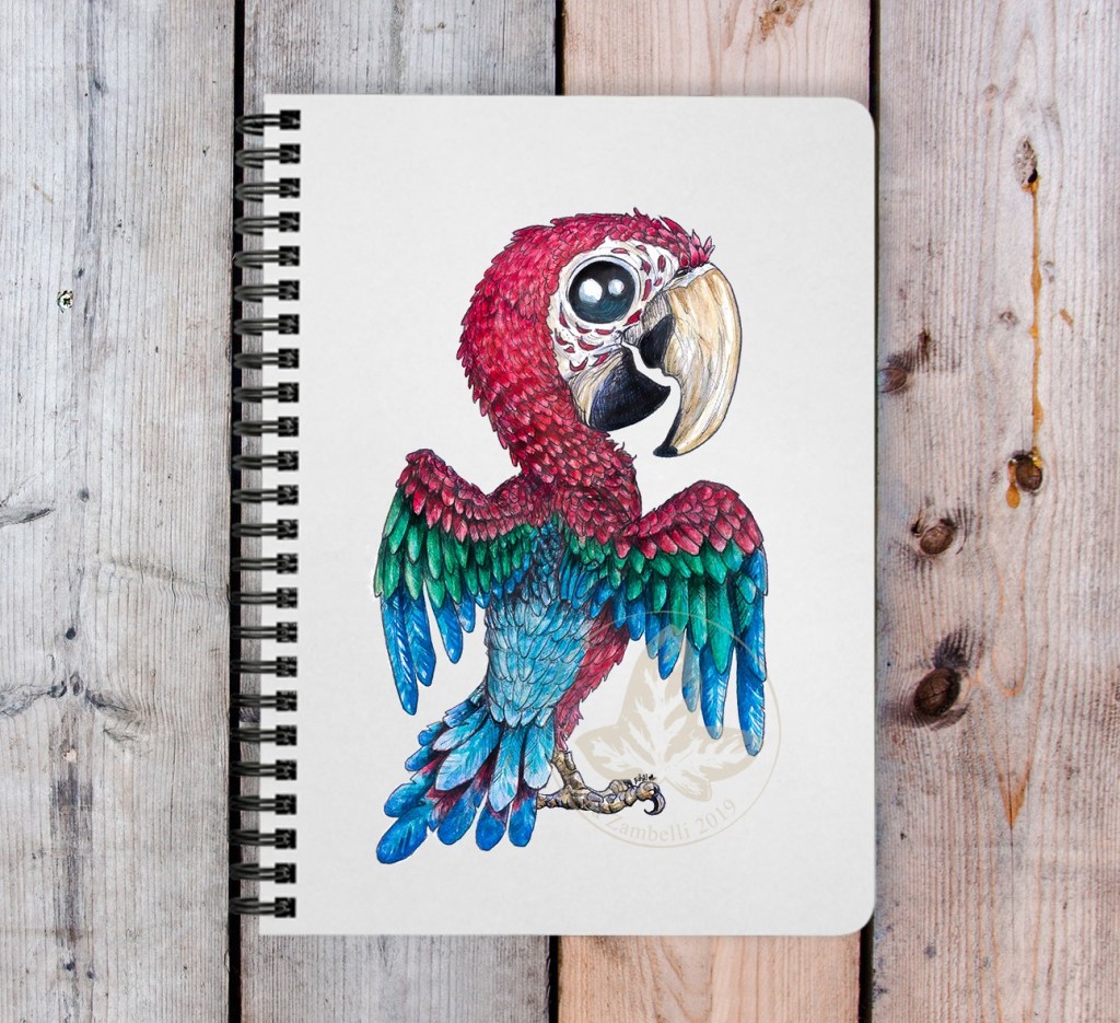 Pappagallo Ara ali verdi – Ara chloropterus 10×15 cm watercolor and pen on paper + digital correction – Cutie birdie series //