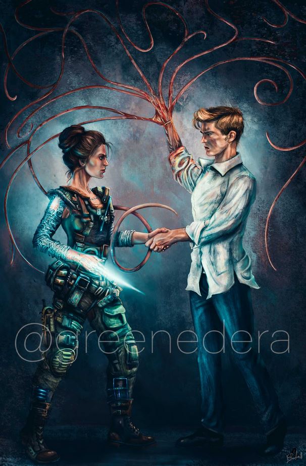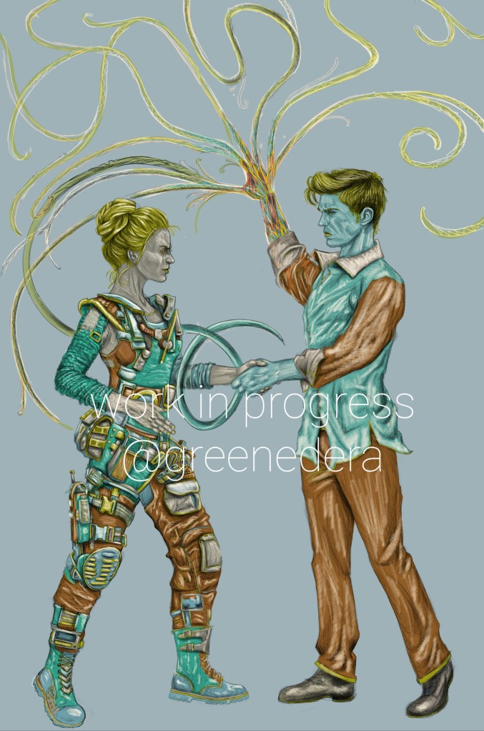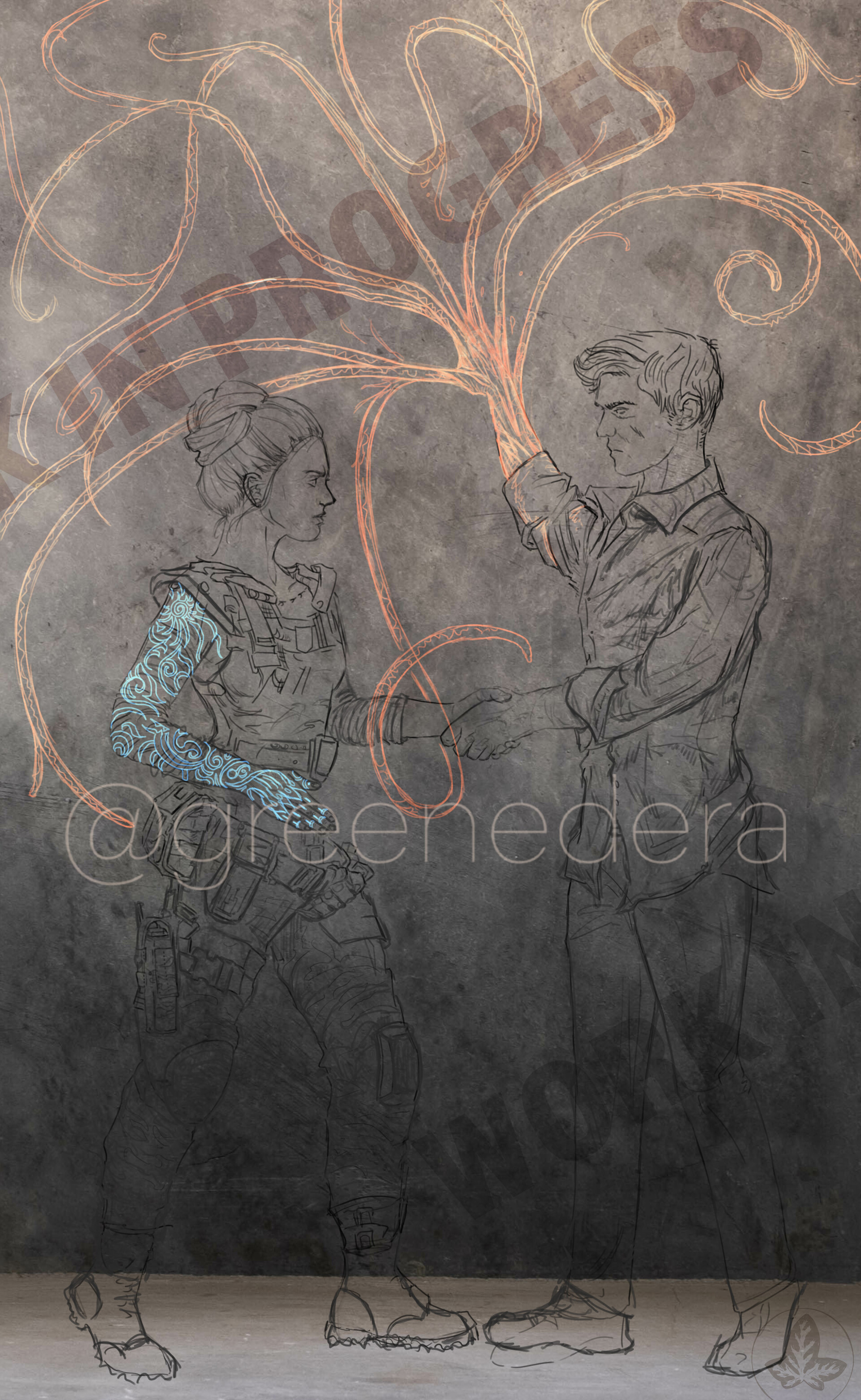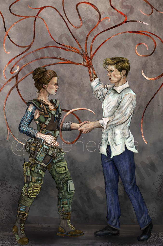 Friends and enemies at the same time, these two OC are facing a difficult challenge and come to a truce despite not trusting each other: one preparing her special magic carved on her arm, the other with his gory tendrils showing his demonic nature. Commission for C.