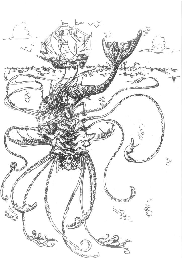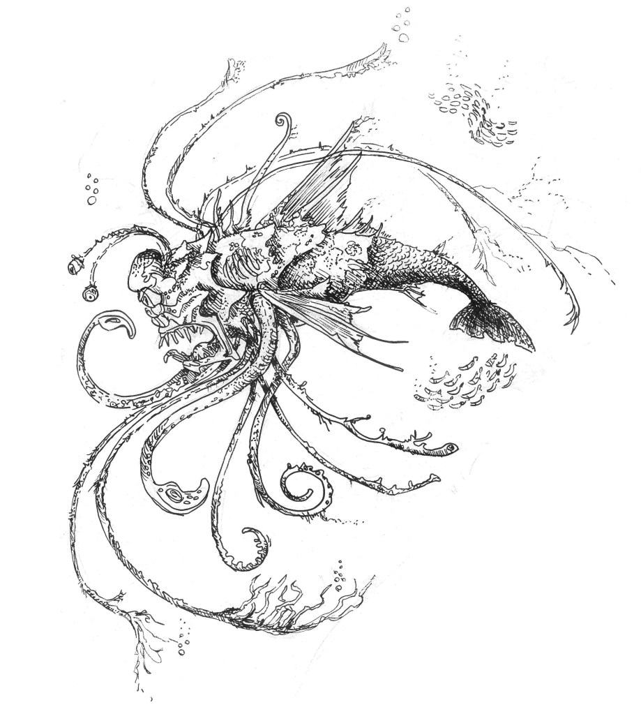 Digital sketch/painting of an aboleth, a marine monster of the D&D universe. This particular specimen is unique, created for a private D&D Dragonlance campaign. Commission for A. T.