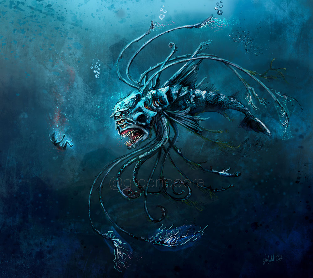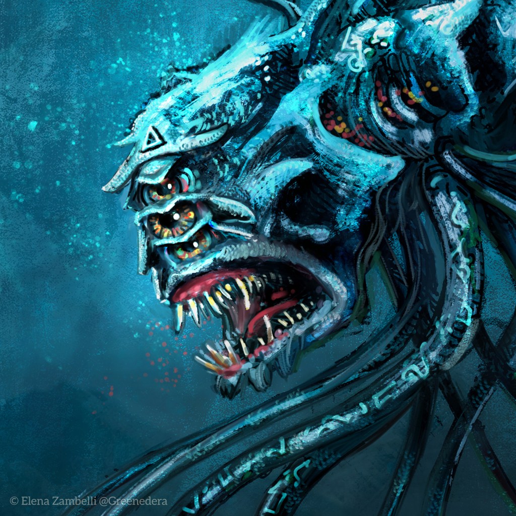 Abolets were depicted in various ways in the D&D universe, from stingray-like creatures to almost-wormish ones, with shark-like or tentacled maws. The few characteristics always in common between the different editions are the three eyes, positioned one under the other, four or more tentacles and a relatively small caudal fin compared to the head. This representation is designed based on the commissioner’s vision, also giving additional characteristics, such as the luminous runes and magical tentacles, linked to the particular history of this specimen. The small dinner in front of the aboleth? It’s a dargonesti (marine elf od the Dragonlance fandom).