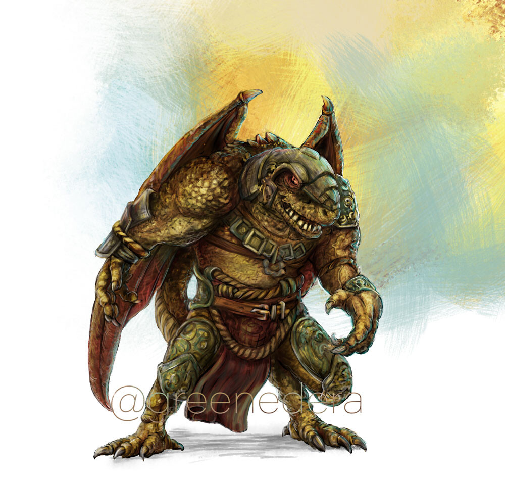 “Baaz Draconians are the smallest of their brethren, made from Brass Dragon eggs, and are commonly used as ground troops. They are usually of chaotic alignment and as a result are interested in getting what is best for them individually. Baaz wear disguises often, concealing their wings and scales underneath large hoods and masks when traveling through non-draconian lands. When a Baaz is killed, its body turns to stone, trapping whatever weapon killed it within the baaz’s stony corpse. After a short time, the petrified body crumbles to dust.” From dragonlance.fandom.com/wiki