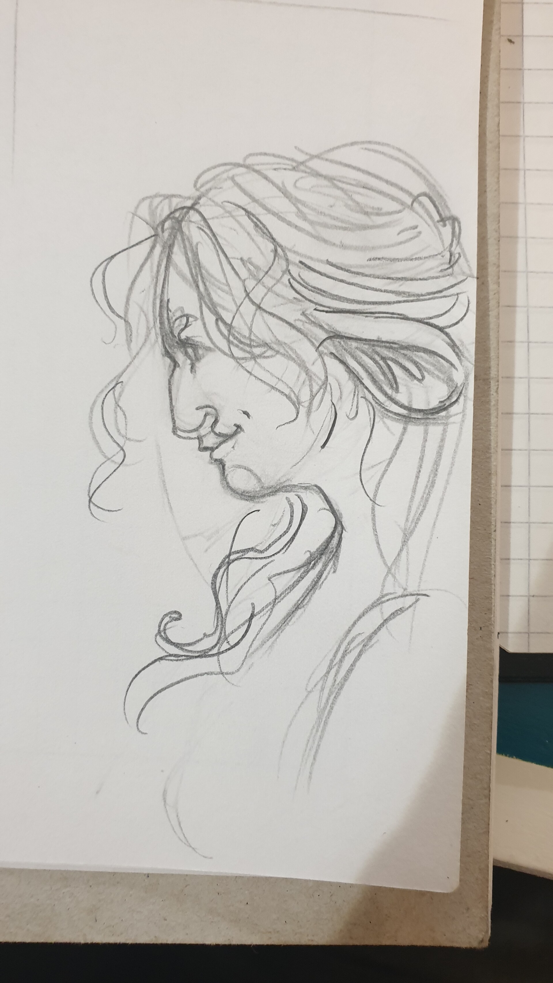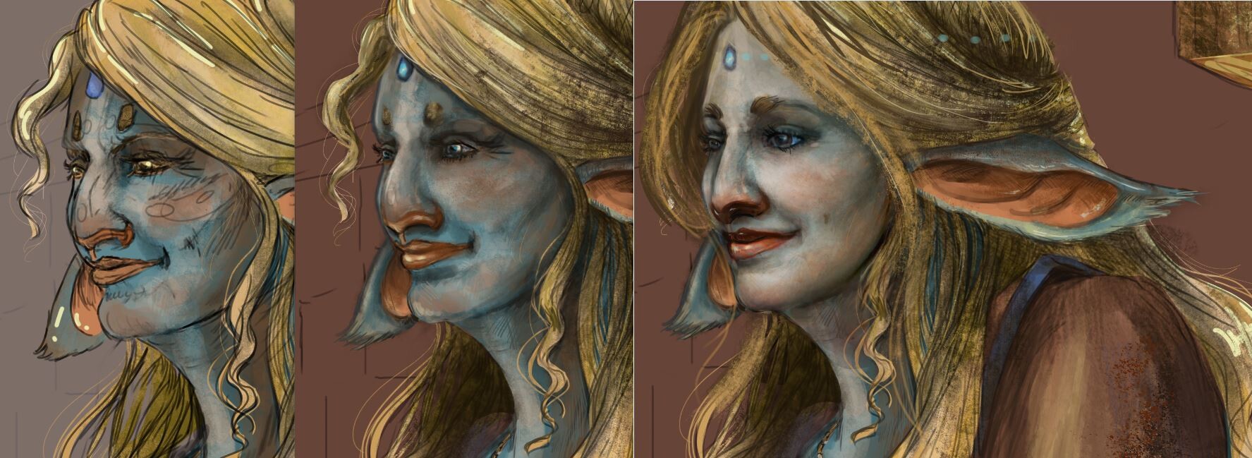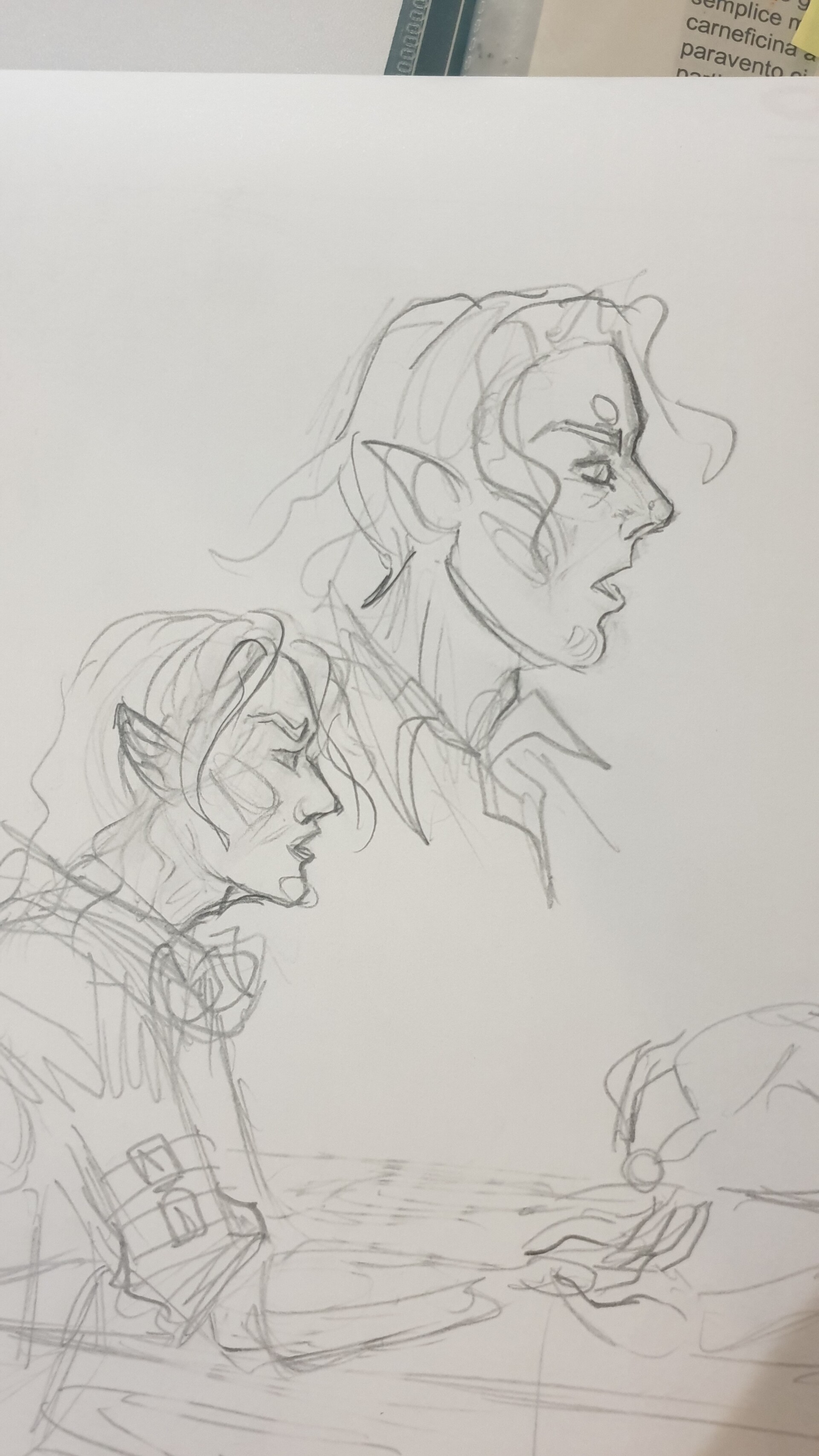 Thaidakar is a sorcerer who’s arcane focus is his broken dagger that maintains its shape with missing pieces filled in with shadow. He has a scar across his neck that was given to him from the beast that raked its claws along his neck and cut his jugular. The scars are rather faded, but still visible and slightly raised. He’s sitting down in a tavern with Dottie, holding a ring she had just given him and looking torn between sadness, gratefulness, and unworthiness. Trying to capture the brokenness of the character who receives a boon they feel they don’t deserve from a character he has come to love. – Tanavast