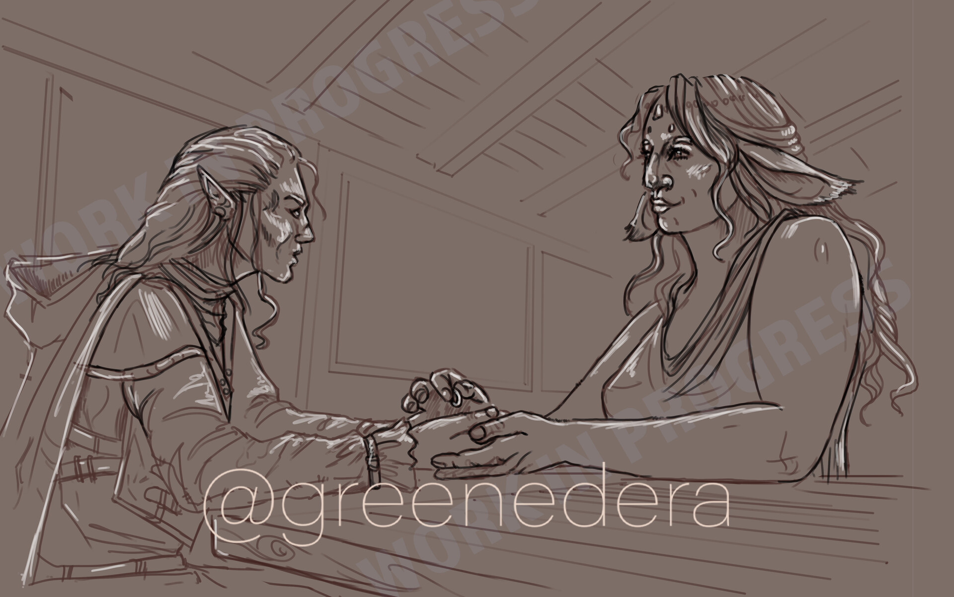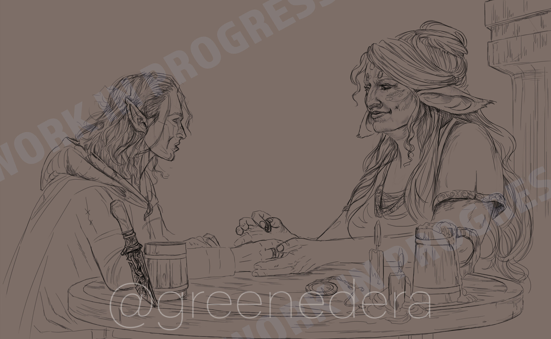 Dottie, a furbolg cleric, is gifting a platinum ring to Thaidakar, a drow shadow sorcerer, with a dark past but a good heart. After a very difficult battle, a quiet moment in a tavern, the exchange of a gift – not just an object, but all the reassurance, trust and gentleness accompanying it. Commission for Tanavast and their Dungeons & Dragons group.