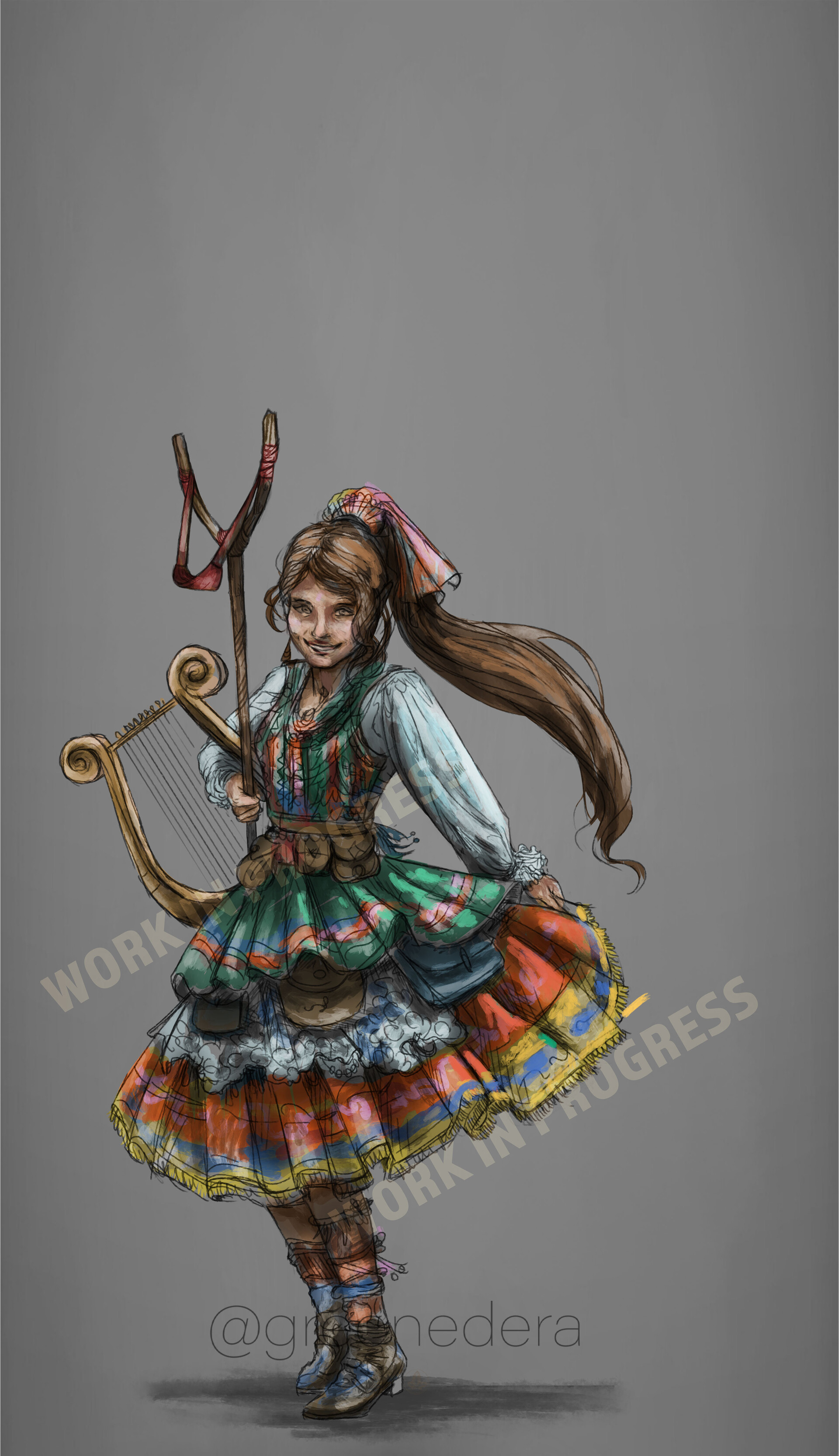 The skirt has various layers, with pouches and pouches hidden under them. The dress is inspired by the Traditional Ukraine Folk Dance costumes, colorful and layered.