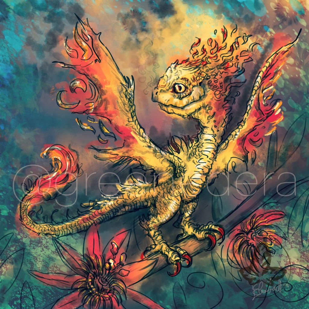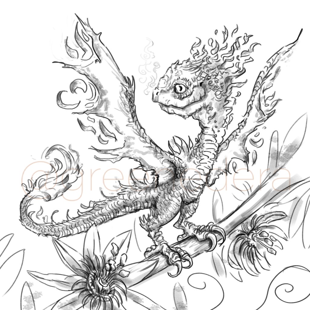 The “Fairy fire dragon” – A draft illustration (pencil, photoshop, Cintiq) painted on January 3, 2023 during the “Dragonary challenge.”