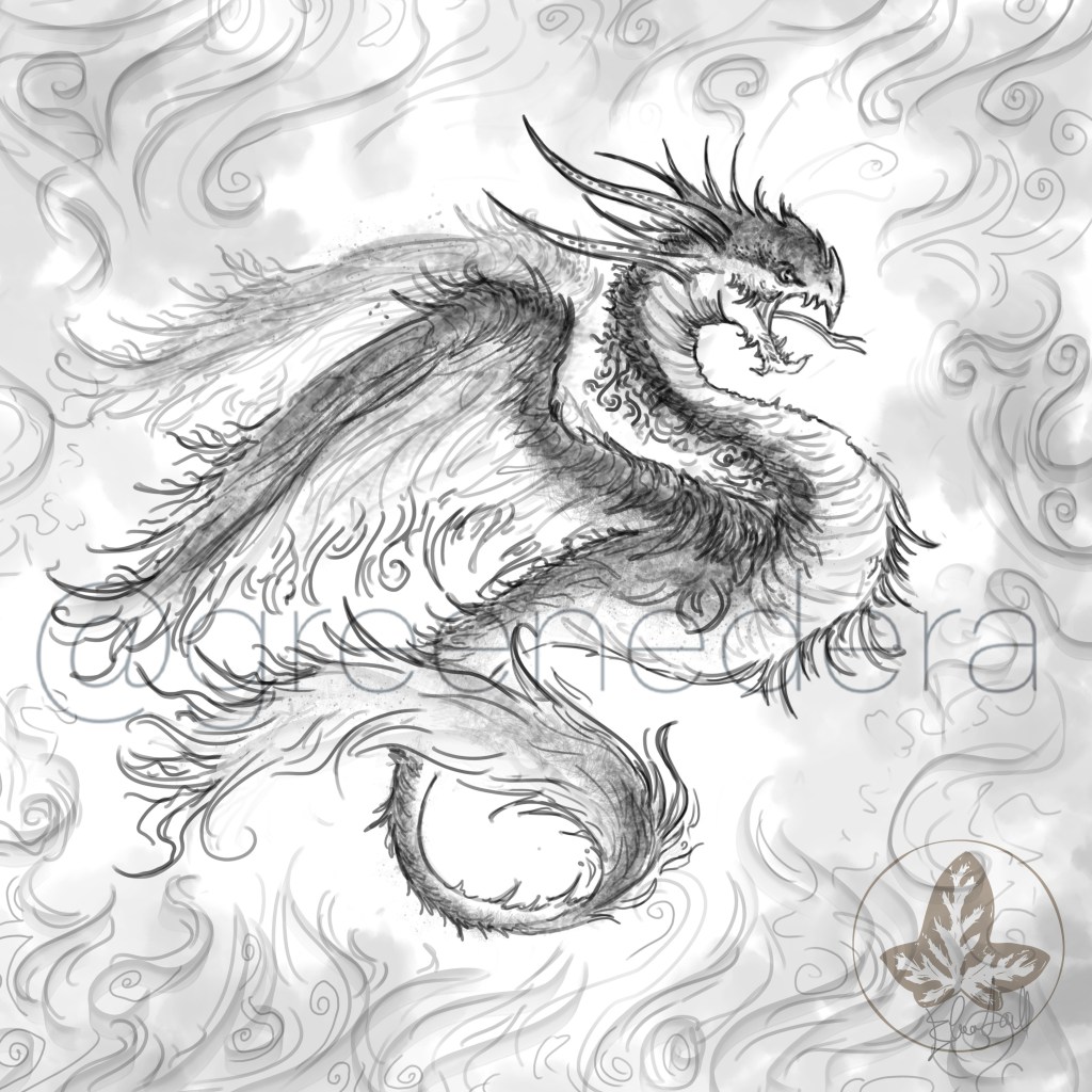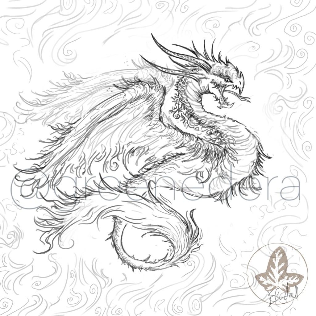 “Flaming amphiptere” dragon – A draft illustration (pencil, photoshop, Cintiq) painted on January 11, 2023 during the “Dragonary challenge.”