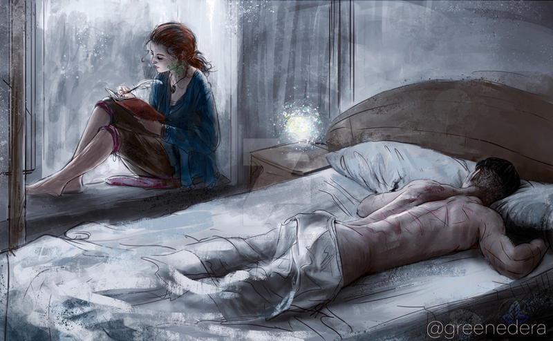The room is dark, aside from the moonlight entering from the window and the little magical light Jeanne summoned to write. The little spark caresses the crumpled linen sheets and the scarred skin of Kurt’s back. It plays with Jeanne’s copper hair and with the man’s dark hair.
