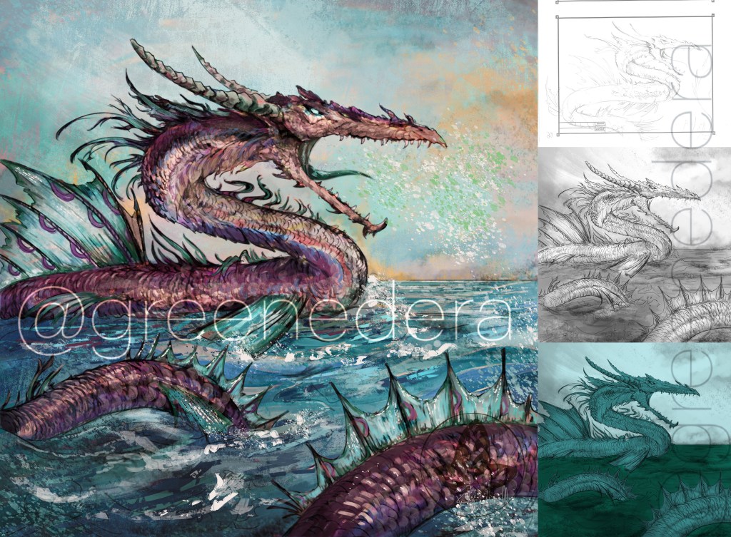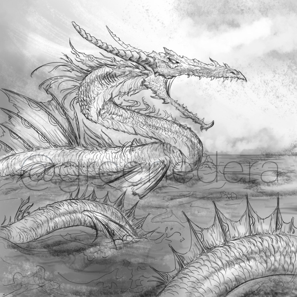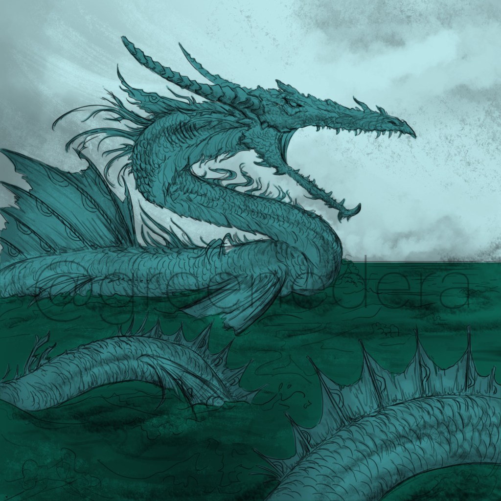 The “Indigo sea serpent” – A draft illustration (pencil, photoshop, Cintiq) painted on January 6, 2023 during the “Dragonary challenge.”