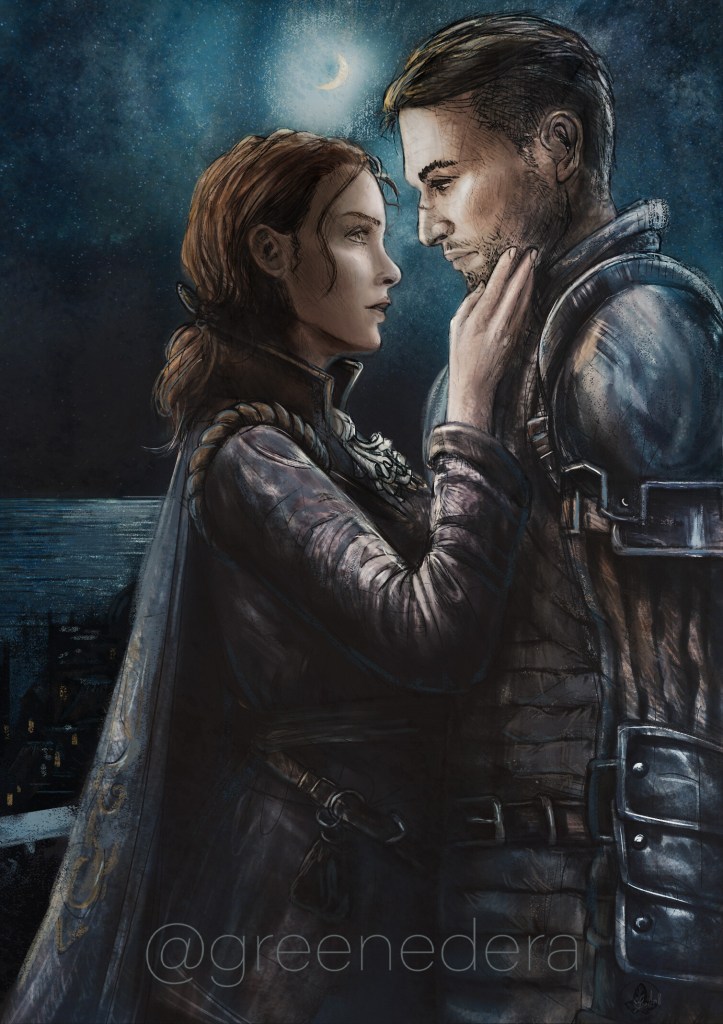 Yet another GreedFall fanart – why not, I loved this game. This is a scene from the fanfiction “The Diaries of Jeanne De Sardet” on AO3. A romantic scene featuring the OC Jeanne De Sardet and the captain of the Coin Guard, Kurt.