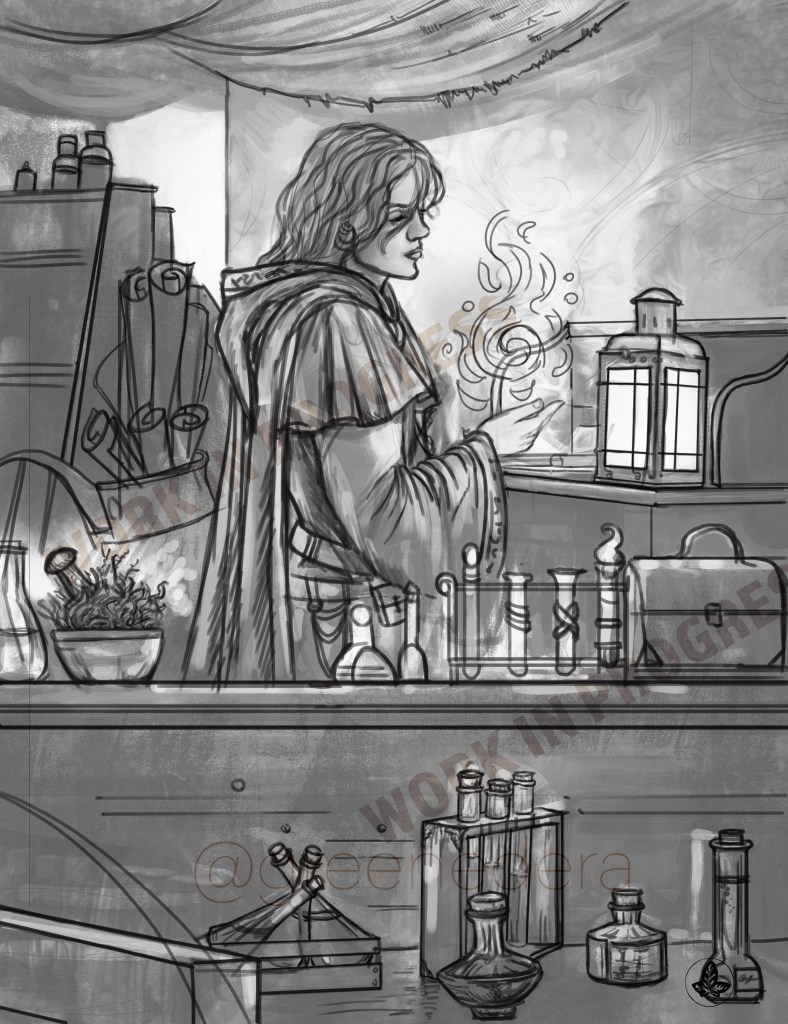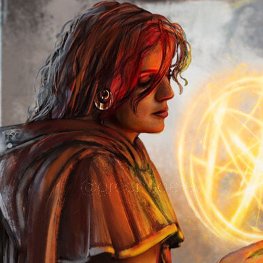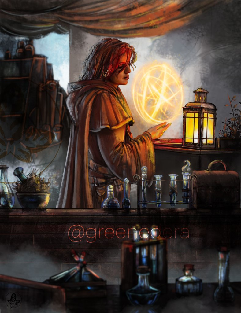 Dragonlance fanart – digital painting of Jenna, a red-robed mage of the Dragonlance fandom, is casting a spell in her mageware shop. 🎨
