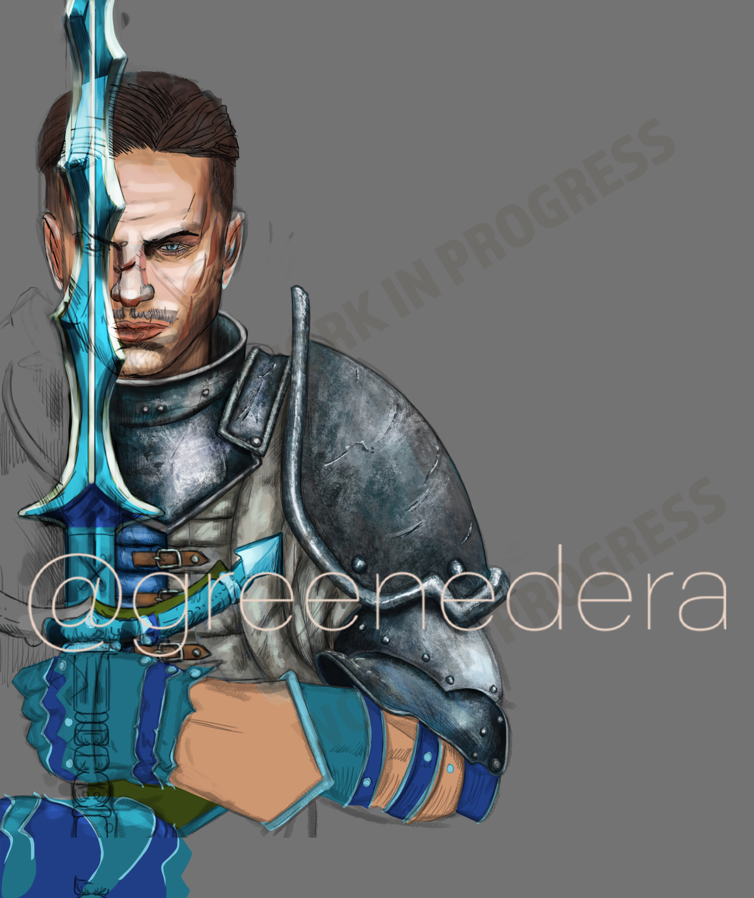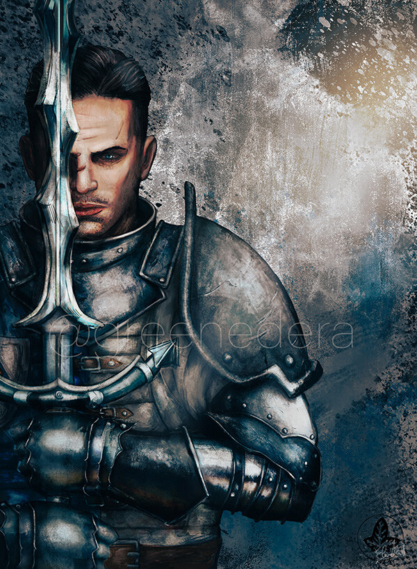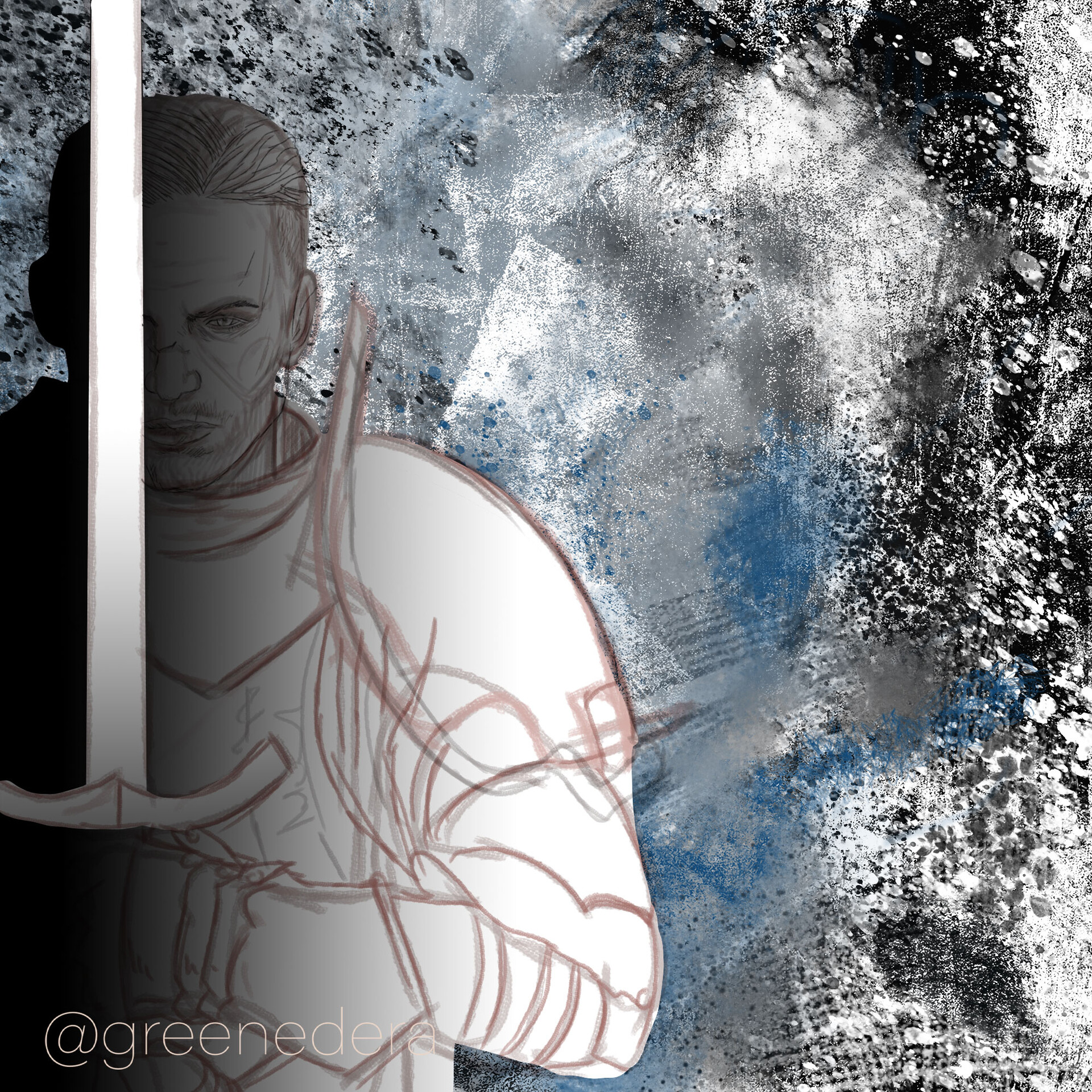 Kurt, (character of the videogame GreedFall ) is portrayed as a warrior standing between light and shadow. Is a sword meant to protect or kill? He can be your best friend, or he can be a traitor, devoured by guilt and darkness.