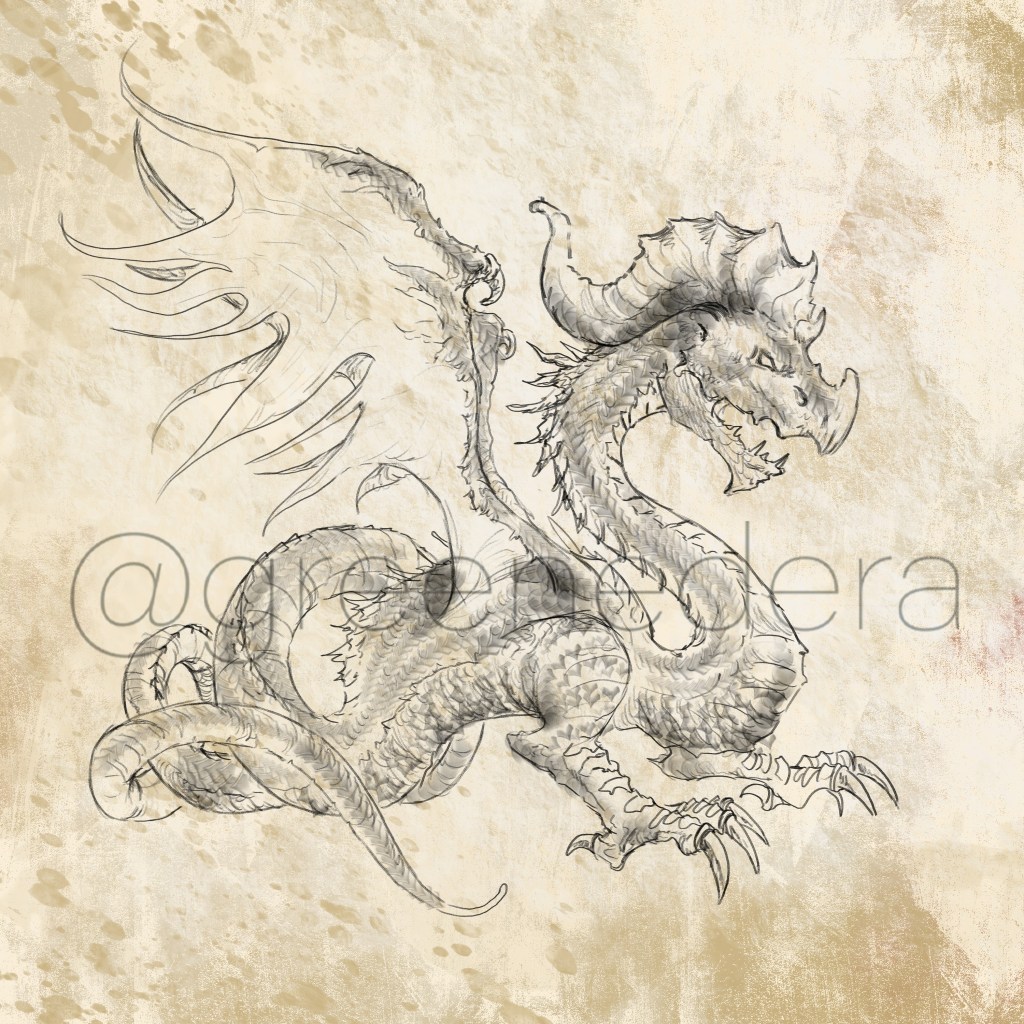 The “Medieval dragon” – A draft illustration (pencil, photoshop, Cintiq) painted on January 4, 2023 during the “Dragonary challenge.”