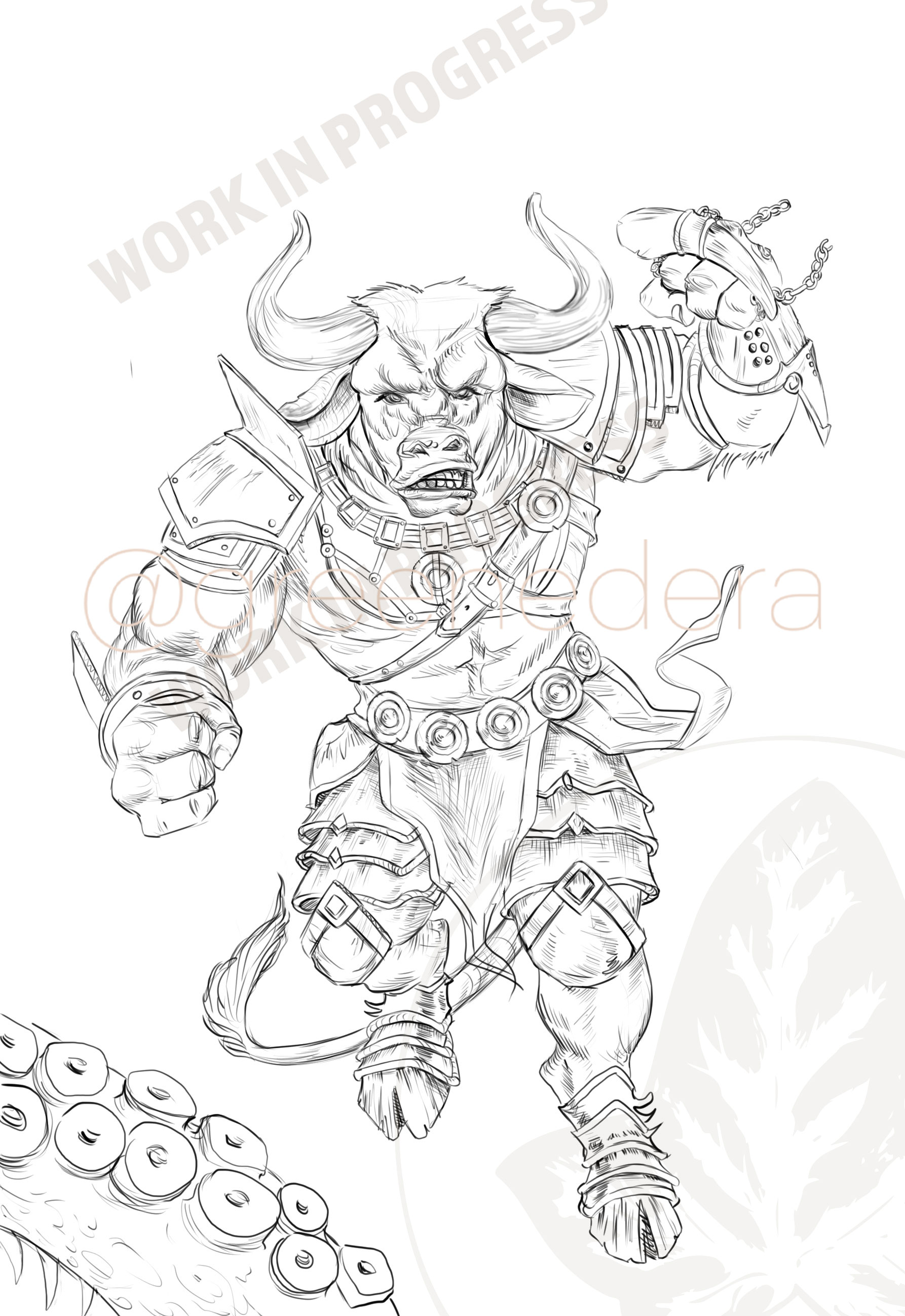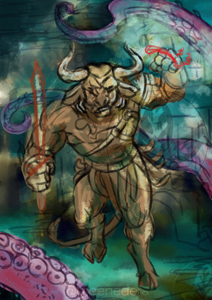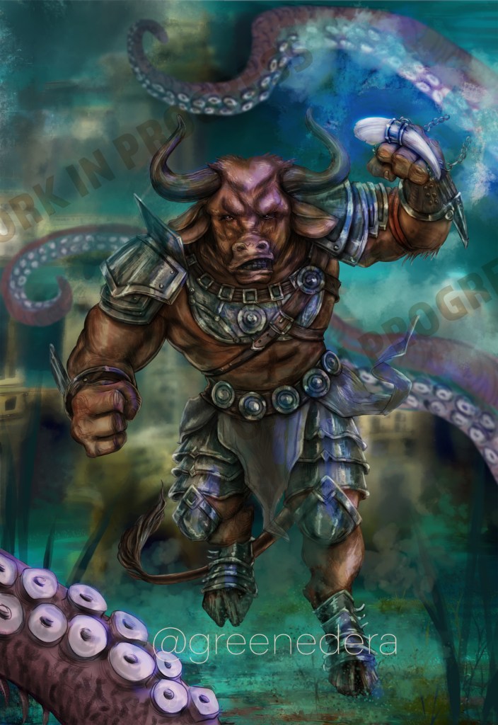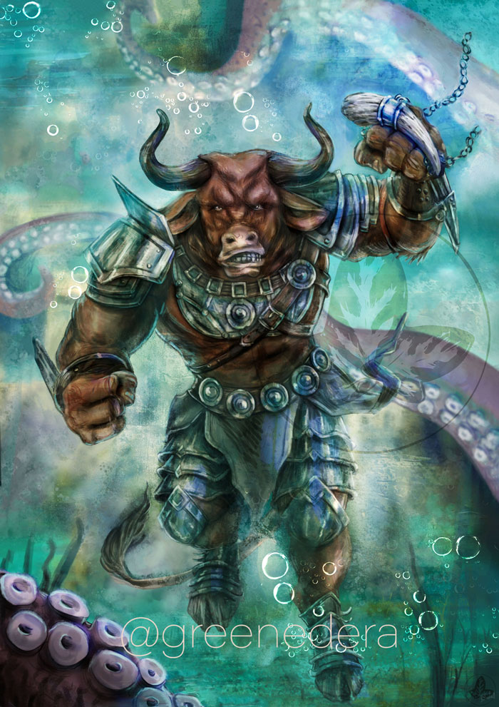 Commission portrait for D.P.: a minotaur, paladin of Kiri-Jolith is charging a monster underwater in the ruins under the Blood Sea of Istar.