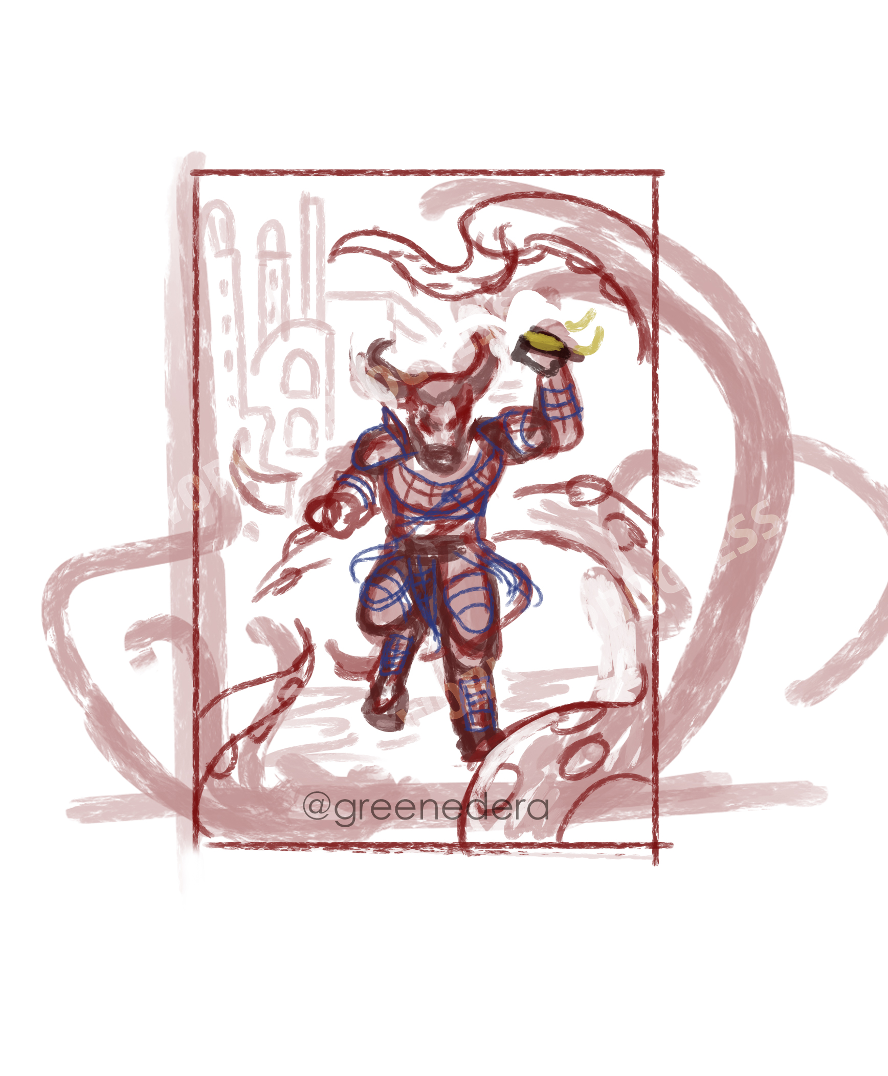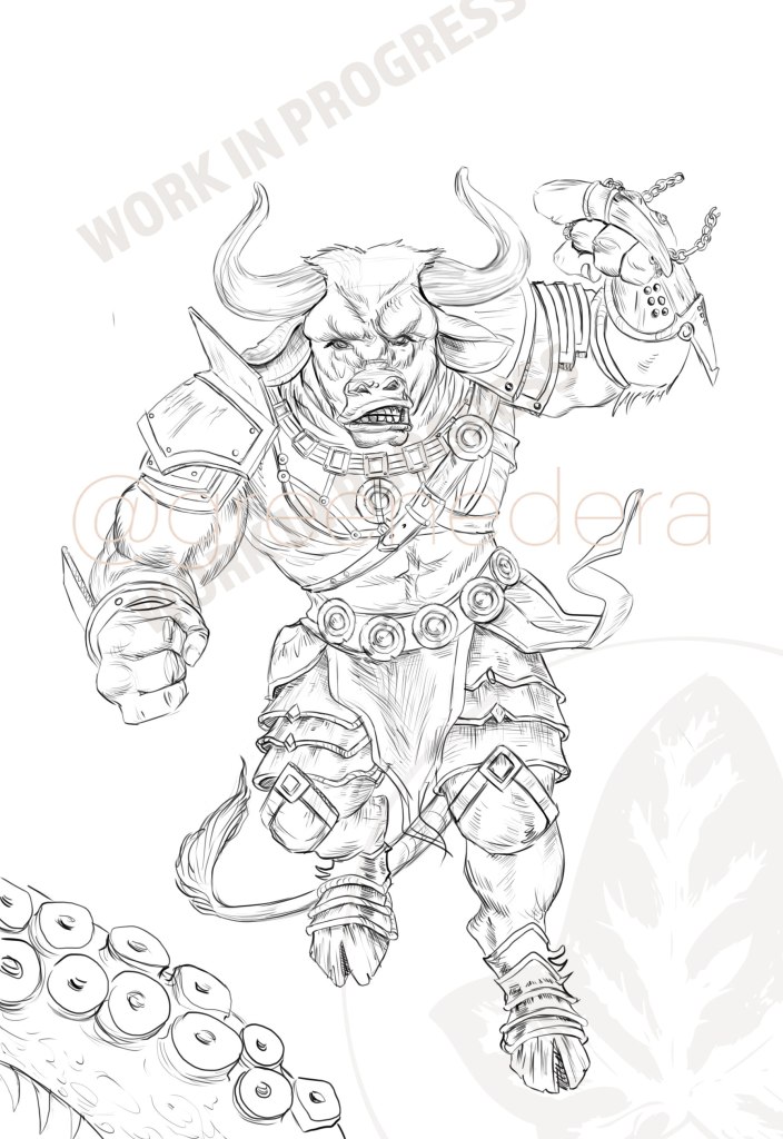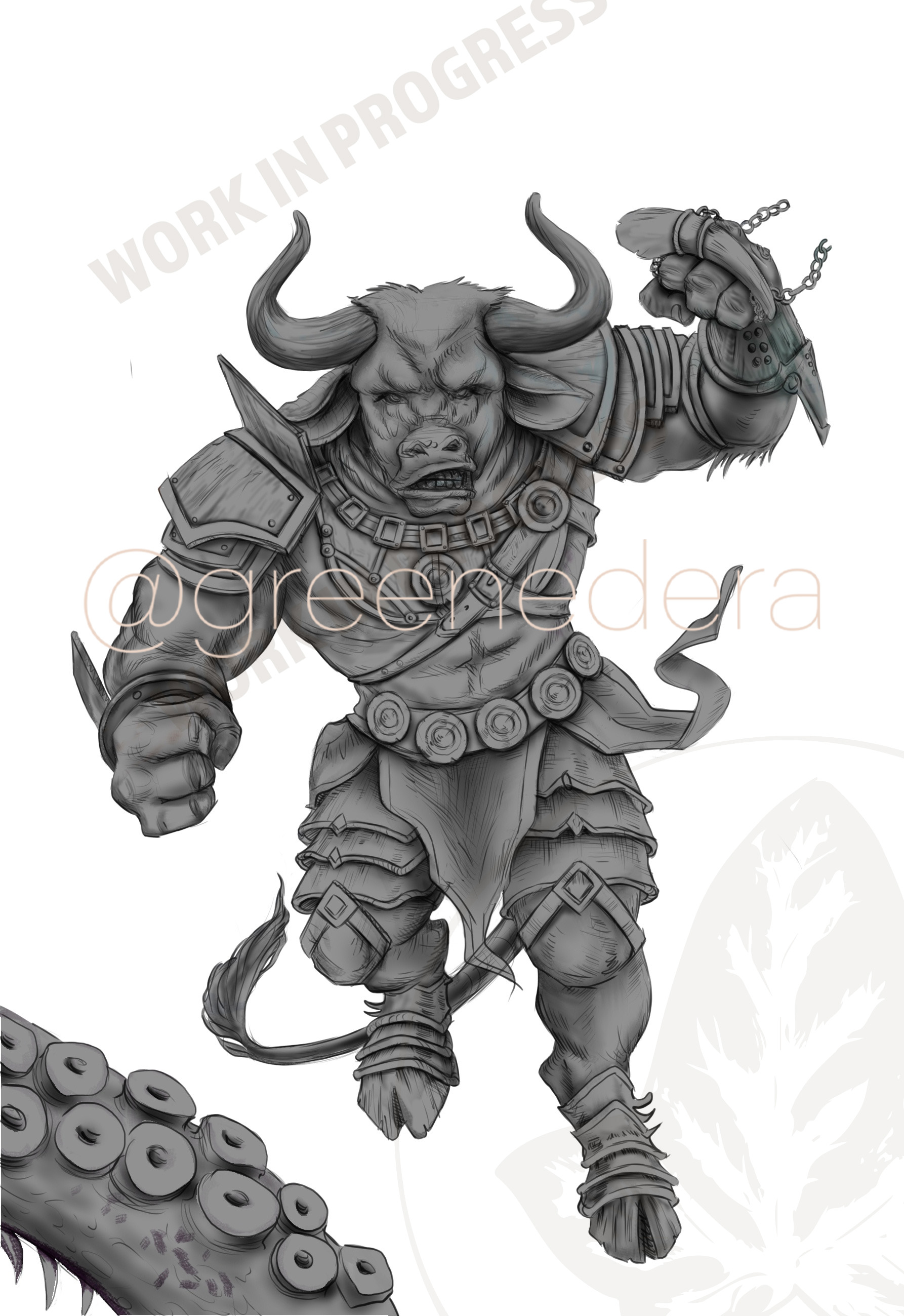 Commission portrait for D.P.: a minotaur, paladin of Kiri-Jolith is charging a monster underwater in the ruins under the Blood Sea of Istar.