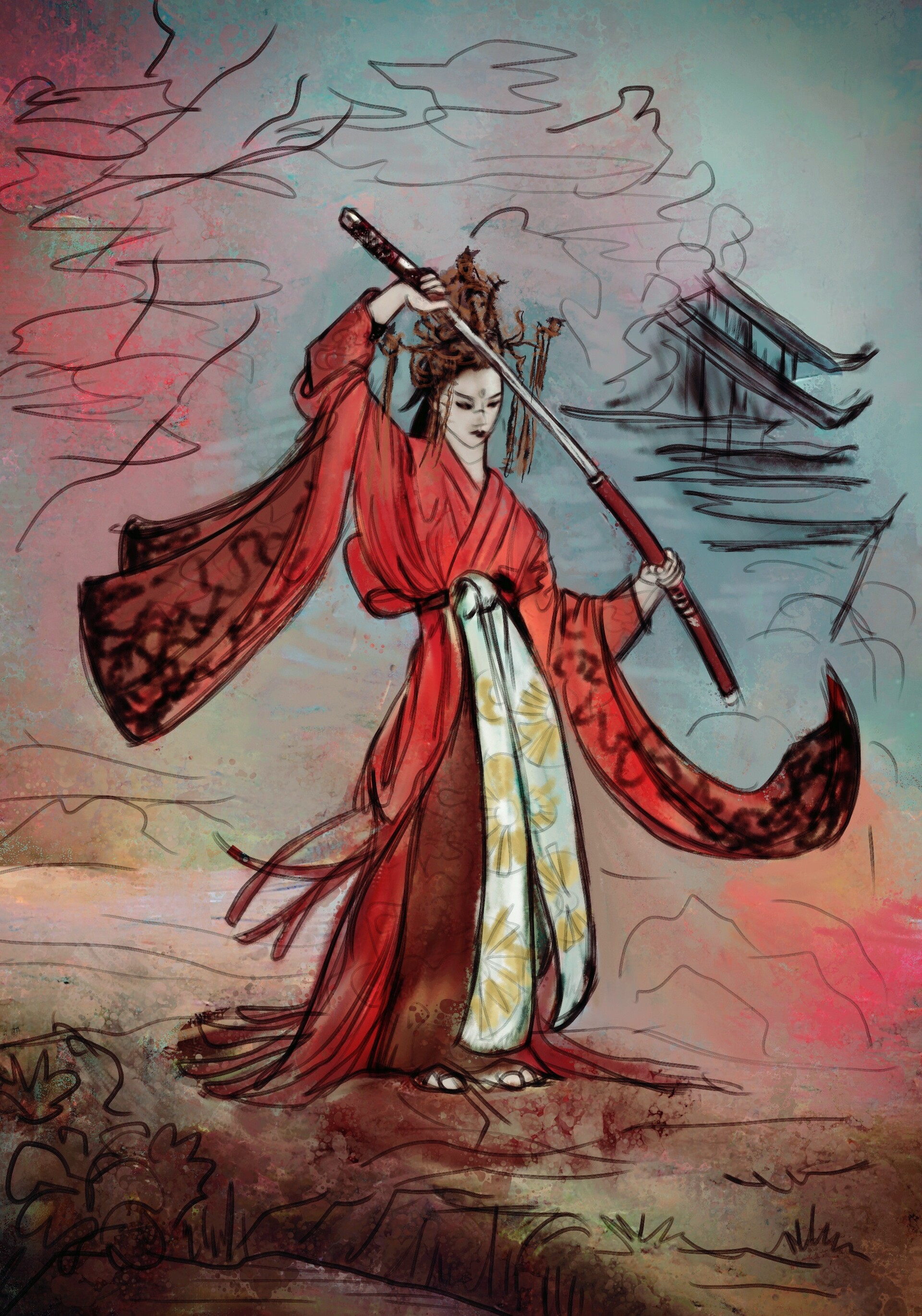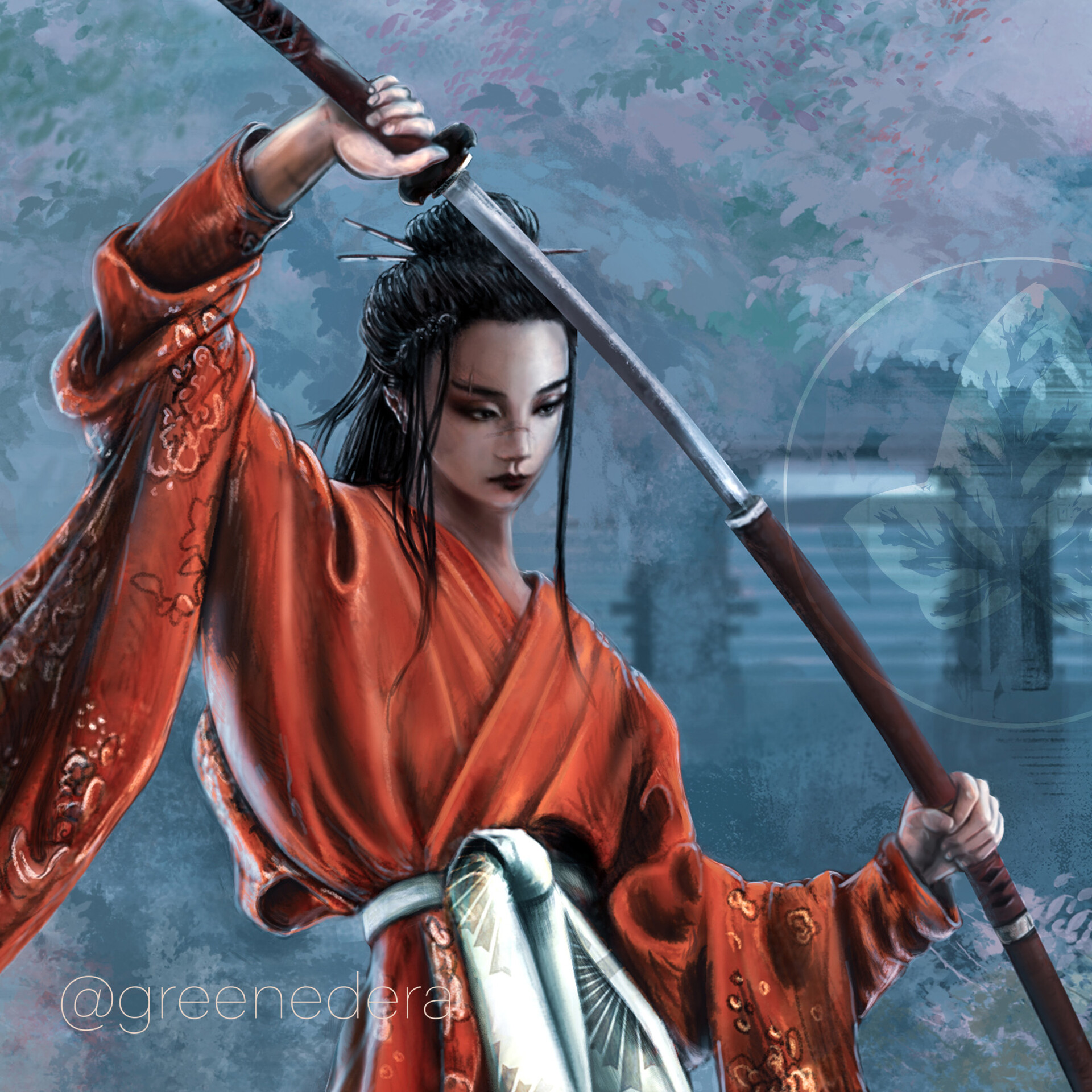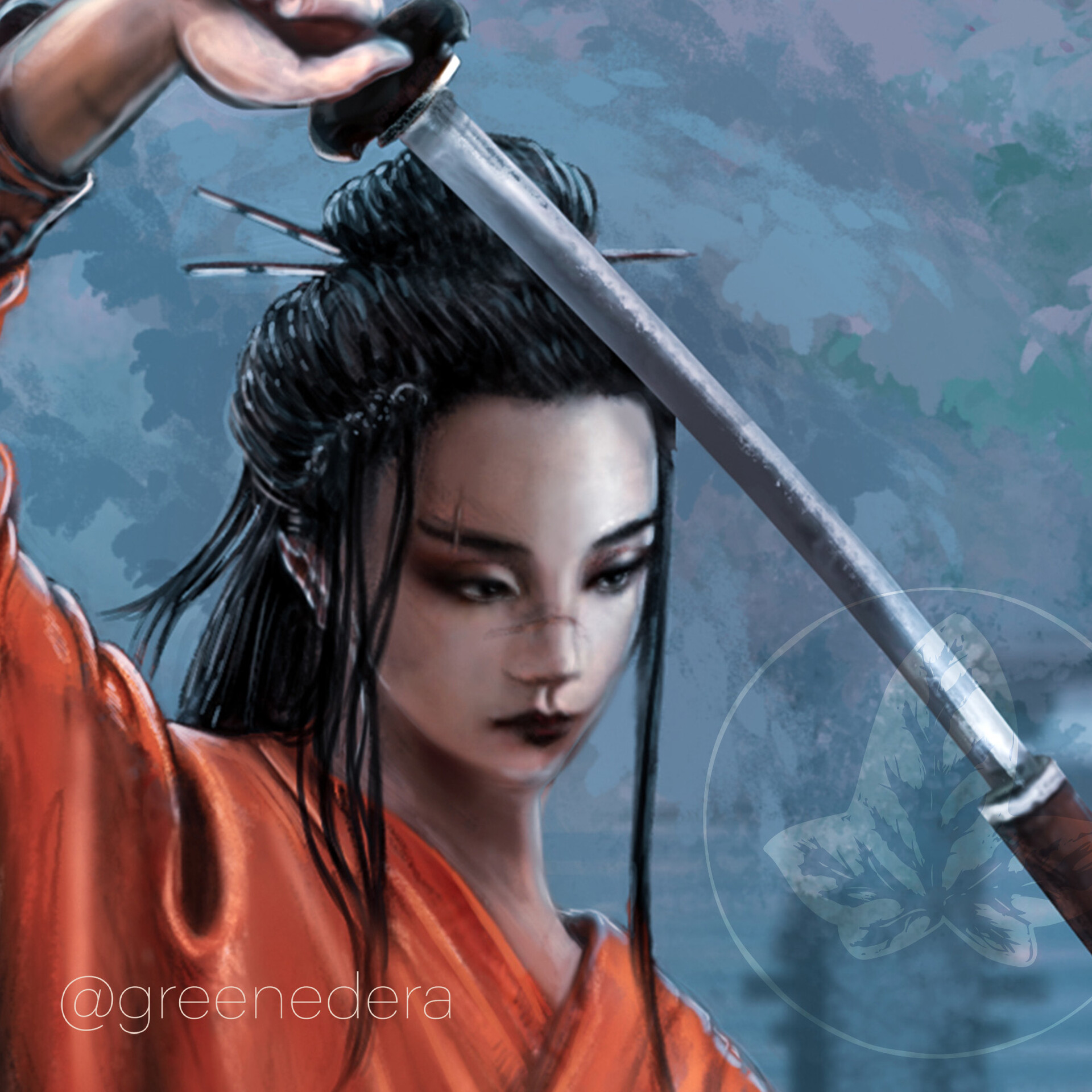 She would be absolutely gorgeous however her face has been cut up and stitched together so many times from the clan wars that she has a crooked smile. She was married at 14 widowed at 19 and now is 20 years old. She’s very strong and flexible for an Onna-bugeisha (female samurai), wearing a Kimono with odi. Miwa is a stern woman and was the judge and executioner on her husband’s lands. She is strictly lawful neutral. She’s also fairly intelligent but is unwise and often blurts out her perspective’s and never lies about it.