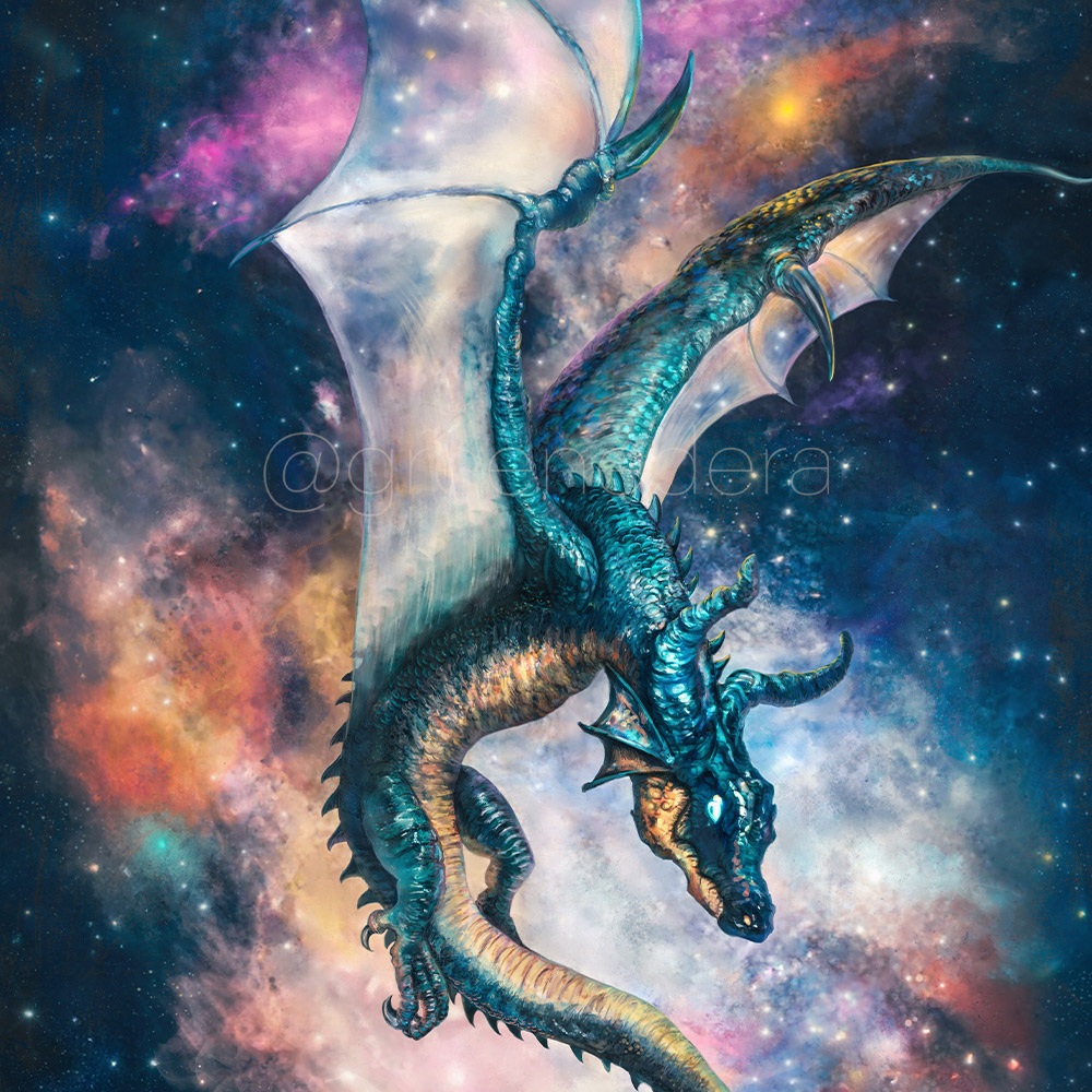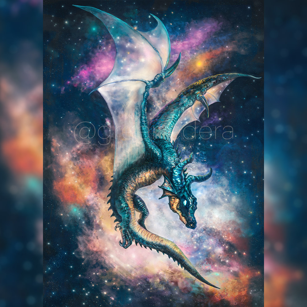 How long does it take to finish a painting? In this case, it took 3 years. I created the sketch, lineart and draft color in 2022, during that month of January spent creating one dragon after another for the “Dragonary” challenge established by Matt Stawicki. Then the painting remained there, and I always promised myself to fix it, to finish it somehow. And here we are. It’s June 2025 and I have finally completely taken over both the background and the dragon, trying not to lose the personality of this fascinating creature that sails among the clouds of dust suspended between the worlds.