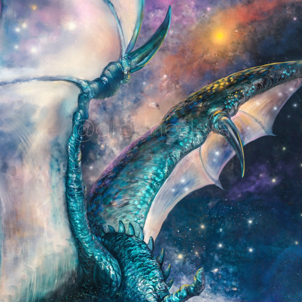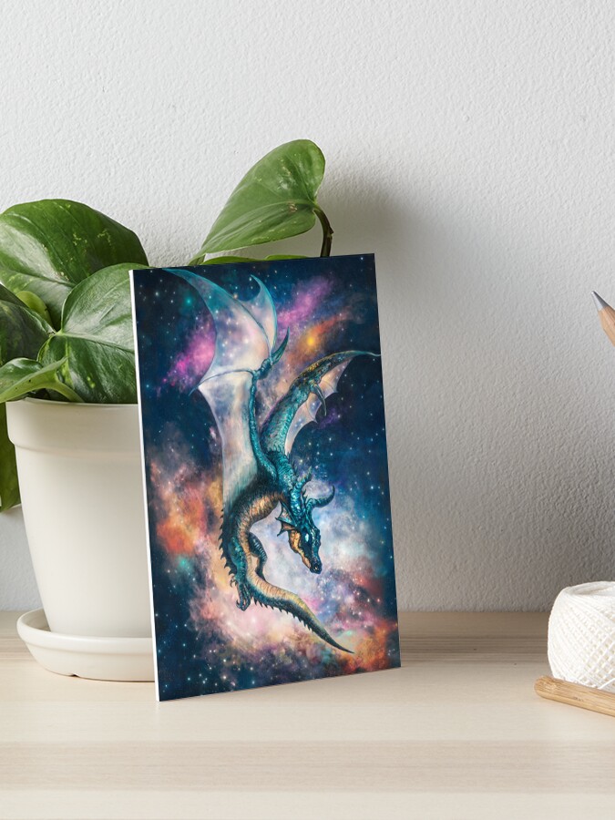 Nebula dragon is a digital painting created with attention to detail. This cosmic painting captures the ethereal beauty of space with vibrant colors and intricate design, and the magic of a dragon drifting among planets and stars.