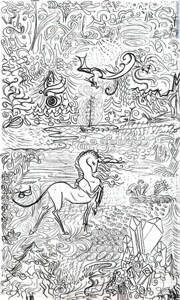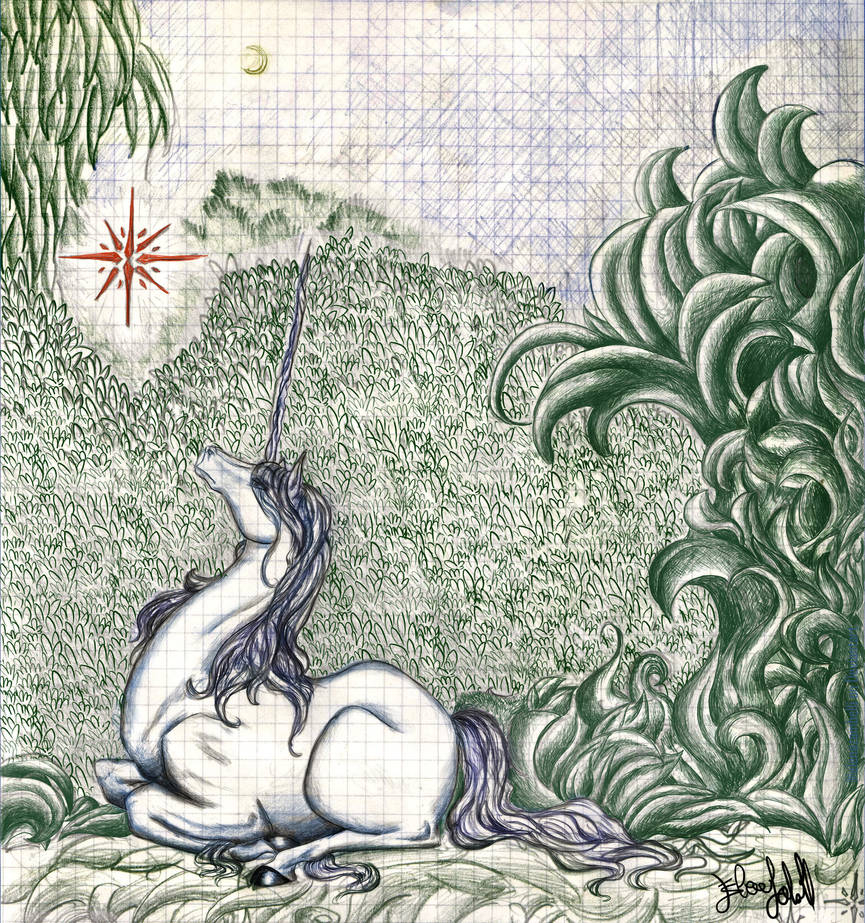 A very old subject for me. The unicorn is not a horse with a horn. Peter Beagle in The Last Unicorn described it: “She did not look anything like a horned horse, as unicorns are often pictured, being smaller and cloven-hoofed, and possessing that oldest, wildest grace that horses have never had, that deer have only in a shy, thin imitation and goats in dancing mockery.” – In the heart of the forest, in the heart of the night, the unicorn opens his heart and look into itself. – Pencils 2002/4/6 digital color 2007/17