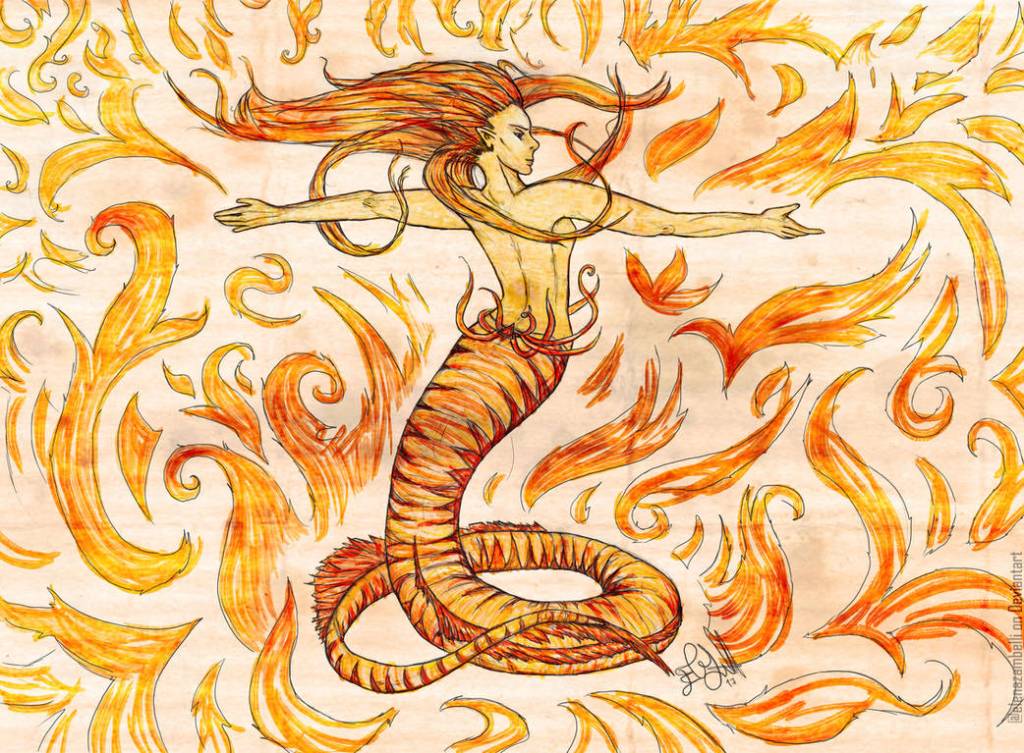 Her skin unscorched, unburn, for she’s fire herself: her dancing and turning aroung generates the heat and the flames. There’s a powerful music she’s dancing on, a tale of adventure and courage singed from human voices. – Salamandra di fuoco – Pencil sketch + intuos and photoshop redrawing and coloring – summer 2017