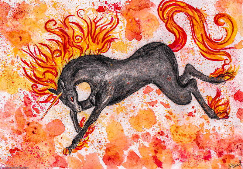 Prancing fire unicorn – Watercolor, 2018 A 15 mins sketch became immediately a wild and watercolor sprayed with red.