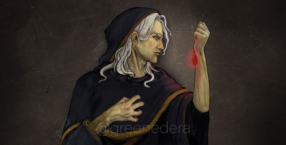 Raistlin Majere, black robe of the Dragonlance books by Margaret Weis & Tracy Hickman, is regarding intently the dangerous artifact he stole from Fistandantilus: the Bloodstone. The necromantic artifact is the key of eternal life, the symbol of the evil actions of the Lich Fistandantilus and of the struggle between the ancient wizard and the younger but powerful Raistlin Majere.In his left hand, Raistlin clutches the Bloodstone, with his right hand he’s clawing at his chest, where a burning pain is devouring his lungs since his Test of High Sorcery: the Test in which Fistandantilus took hold of his soul.