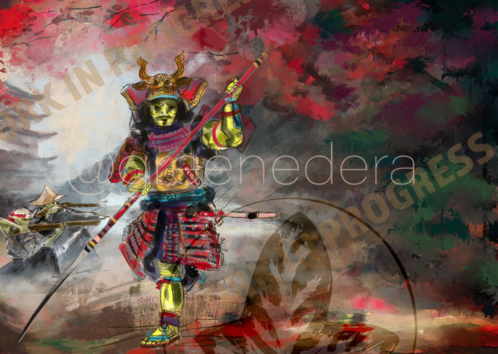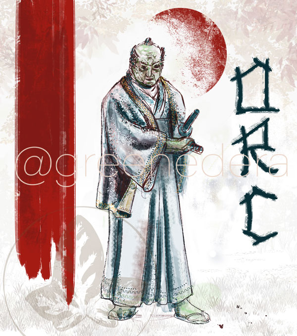While painting the samurai orc, I felt the need to try a different concept to explore the setting. So I did a quick sketch of Samurai Sempai 🙂
