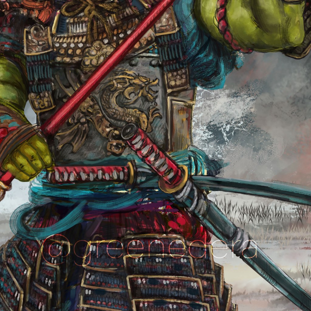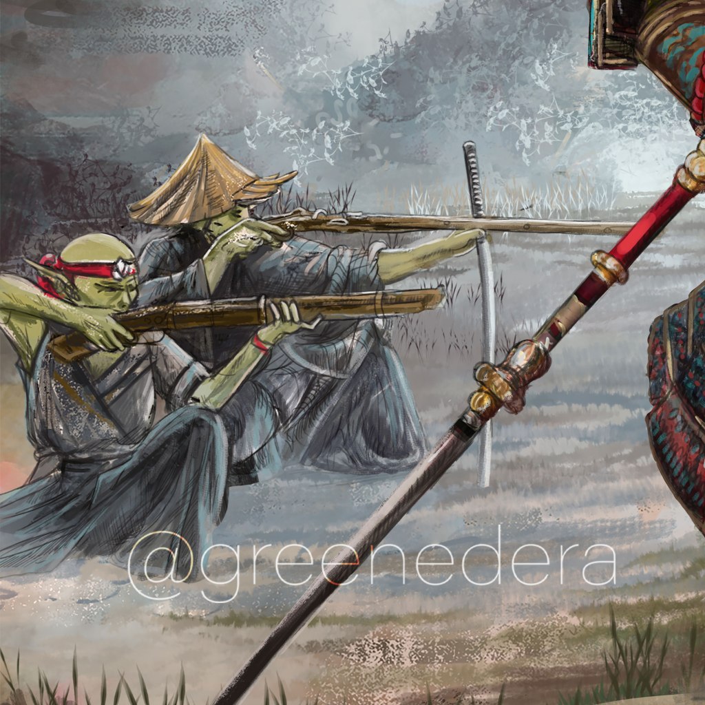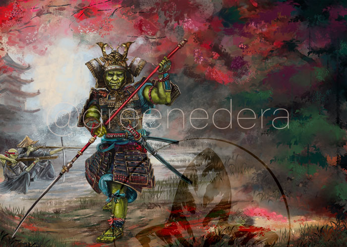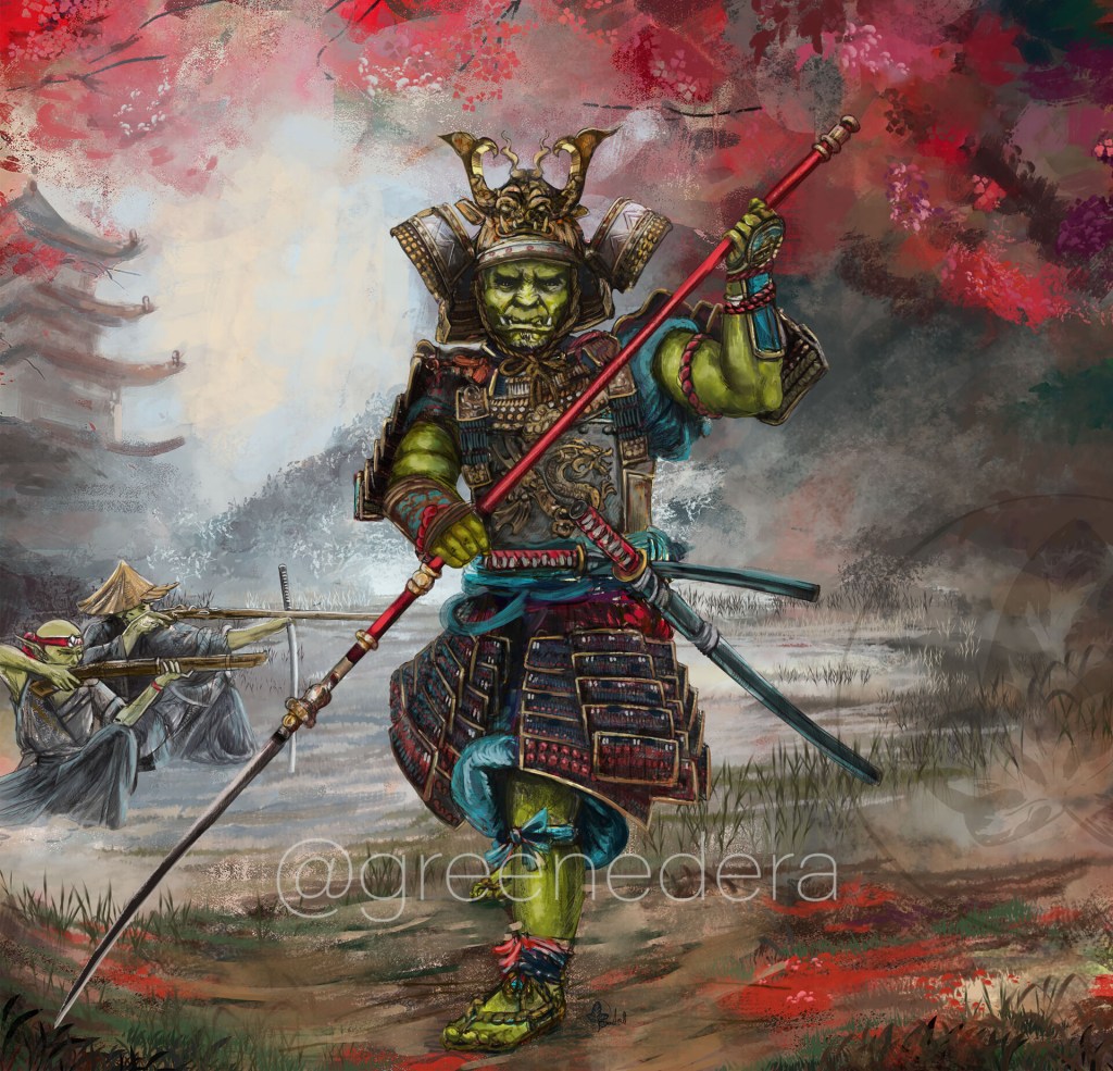 Portrait of a samurai orc wielding naginata, Katana and wakisashi. Near him, a group of faithful goblin ashigaru (pheasants armed with muskets) – commission.