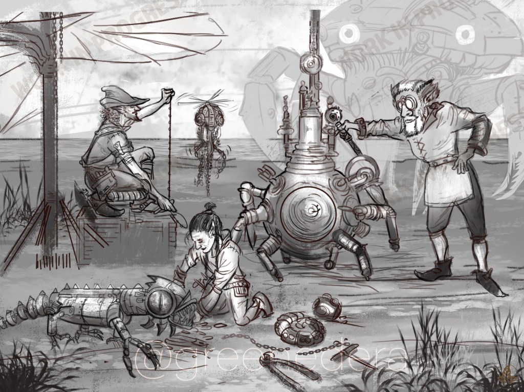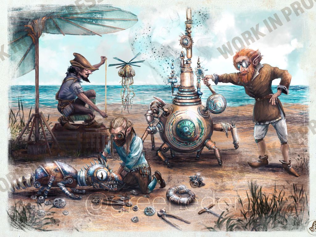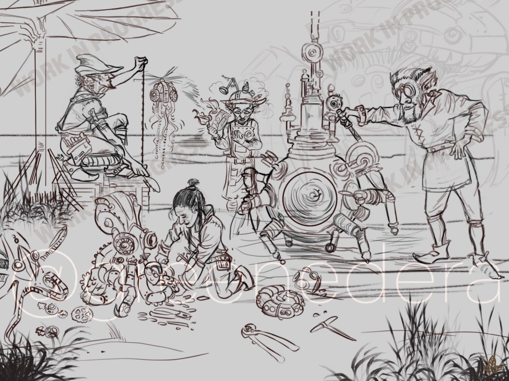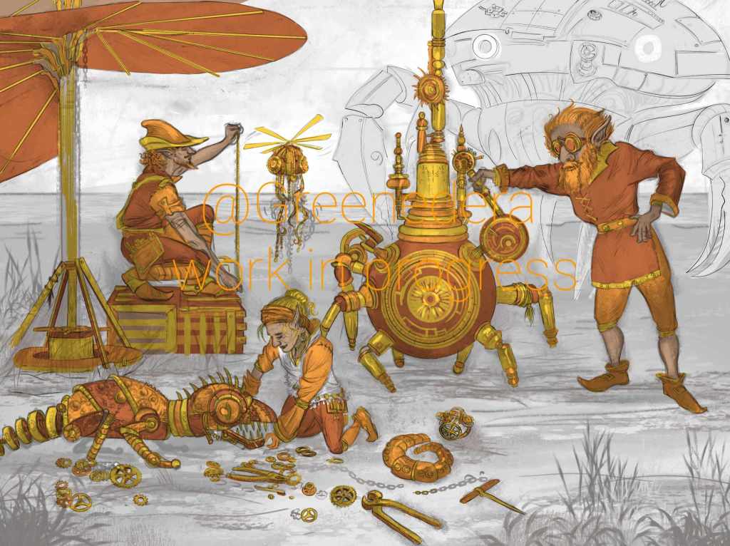 Illustration of gnomish inventors (Dragonlance fandom) busy with clockworks machines. Commissioned by the Dragonlance Nexus as internal illustration for the adventure manual “The Journals of Kaz the Minotaur – The lost colony” featuring a novel by Richard Knaak and a D&D 5th ed adventure.