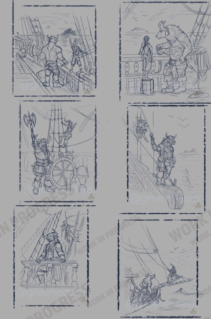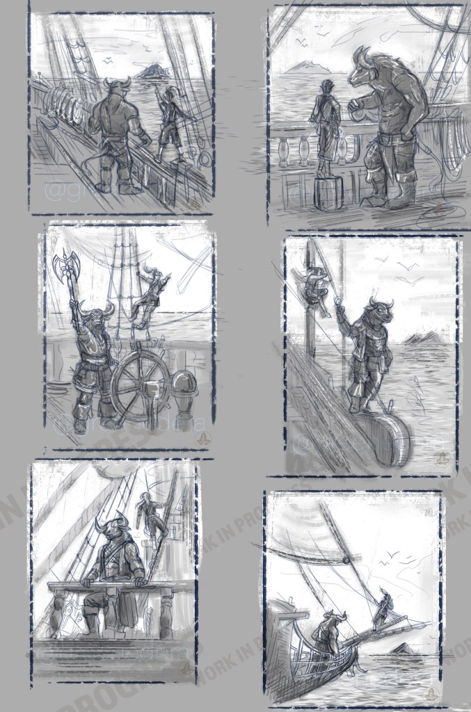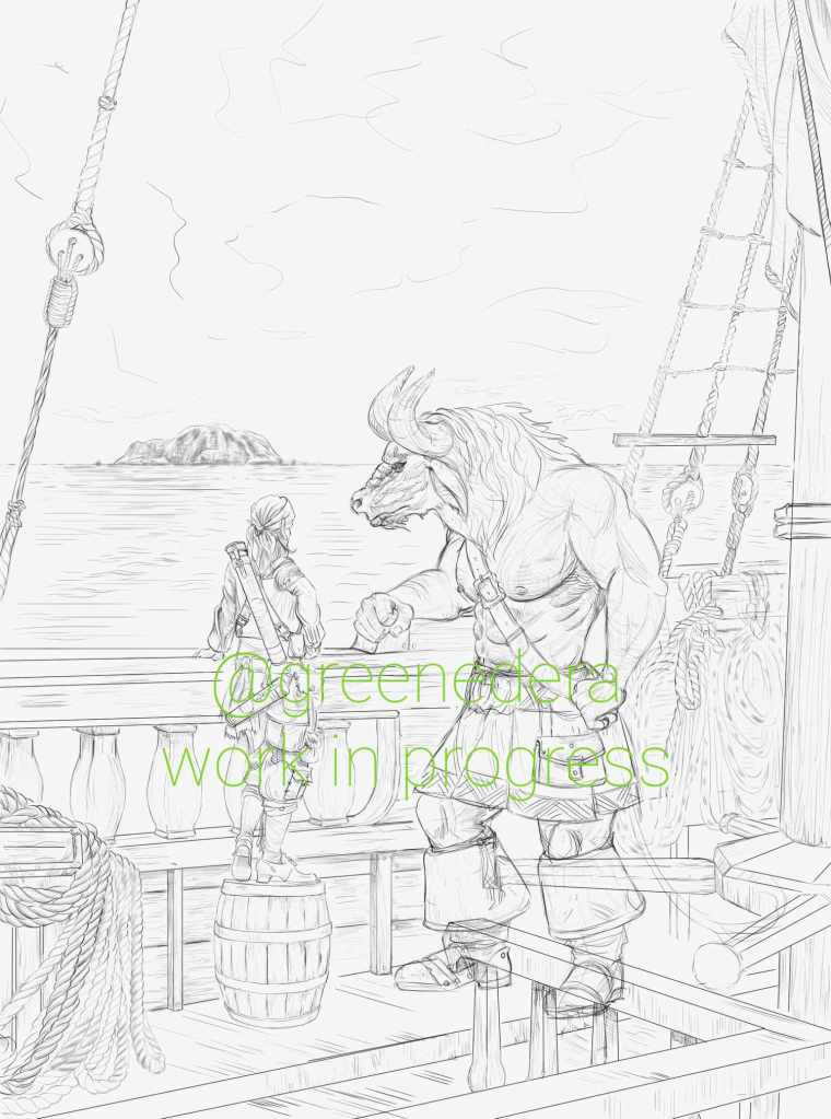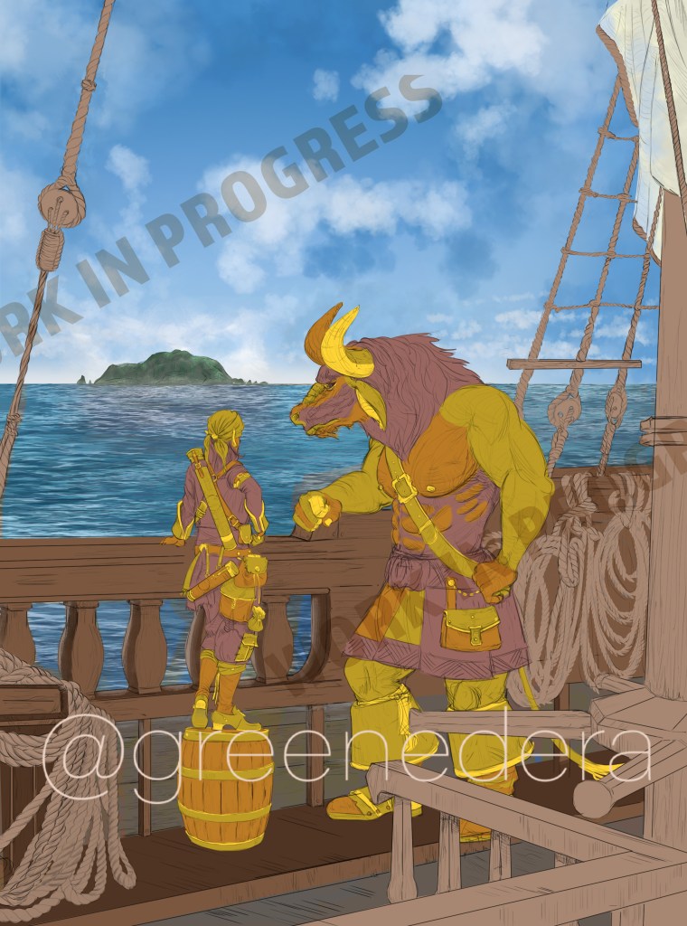 Illustration of Kaz the minotaur and Delbin the Kender (Dragonlance fandom) sailing their ship towards new adventure. Commissioned by the Dragonlance Nexus as internal illustration for the adventure manual “The Journals of Kaz the Minotaur – The lost colony” featuring a novel by Richard Knaak and a D&D 5th ed adventure.