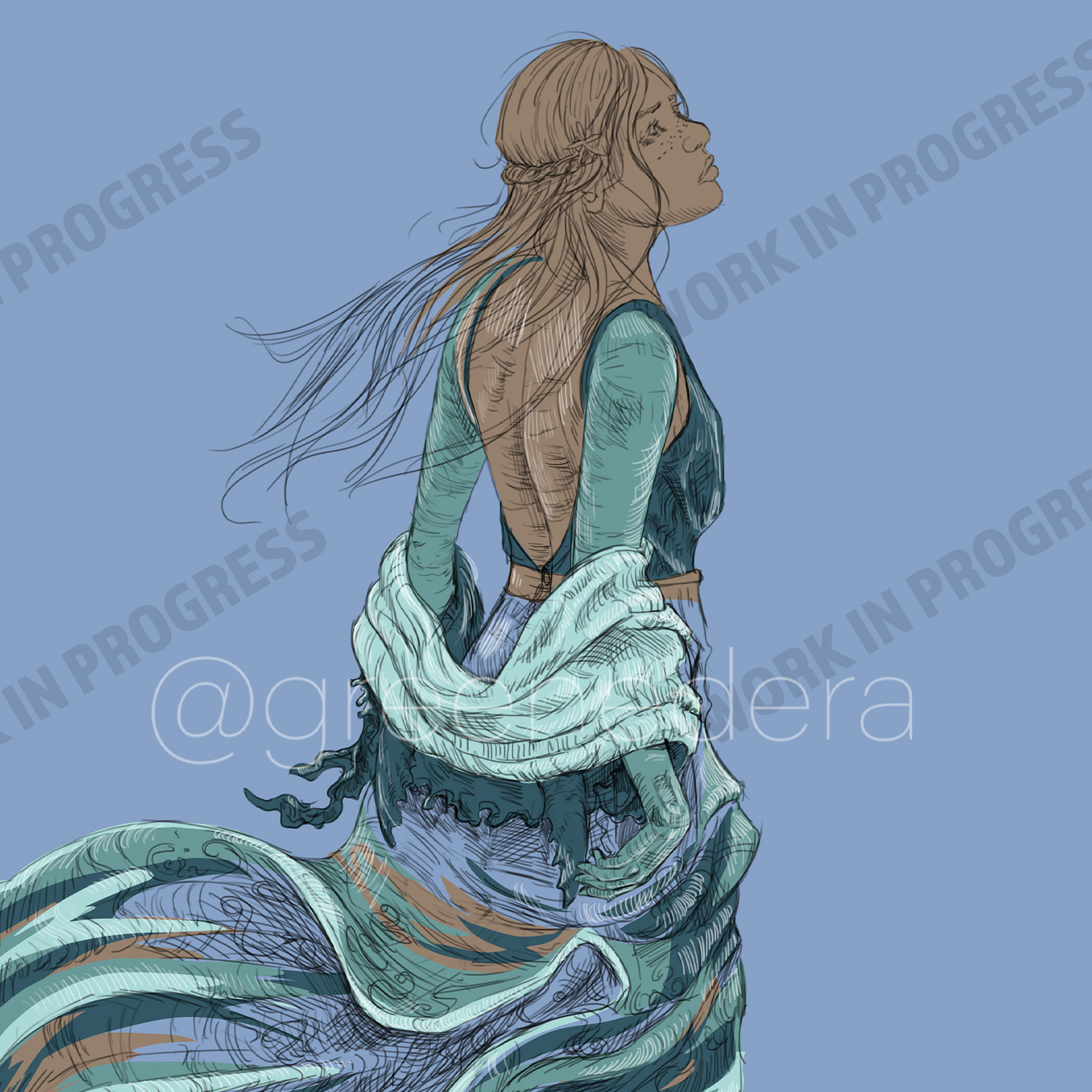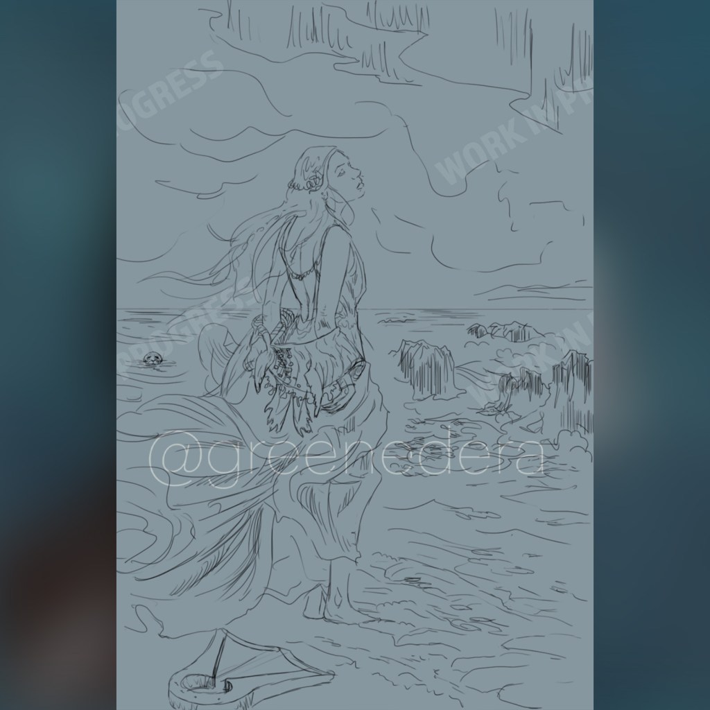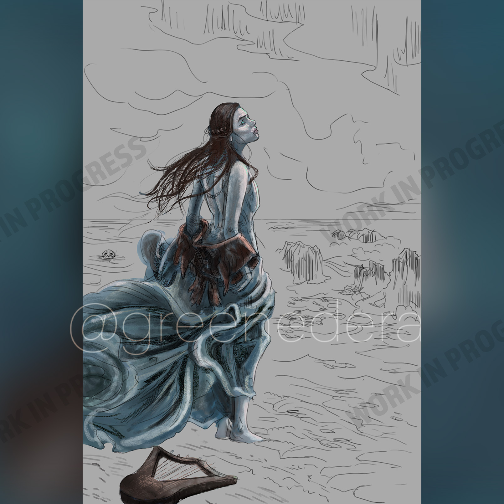 Solace is a selkie bard and an adventurer; she wears her seal skin as a shawl, so that it’s always with her and no one can steal it. She playes the lyre and sings.