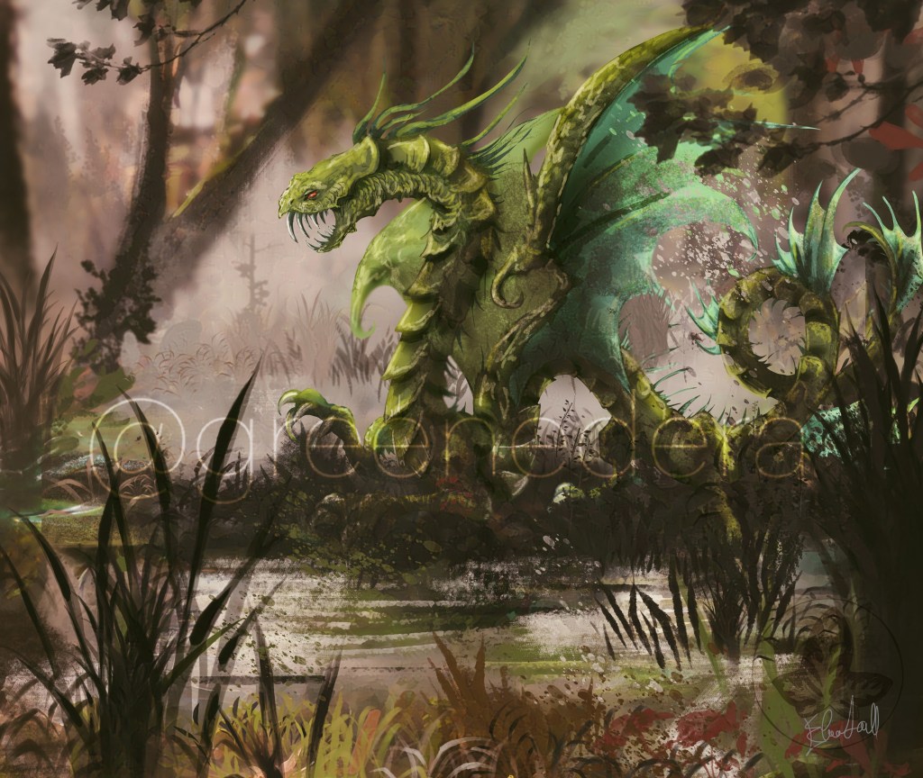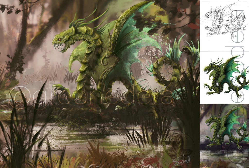 “Swamp dragon” – A draft illustration (pencil, photoshop, Cintiq) painted on January 25, 2023 during the “Dragonary challenge.”