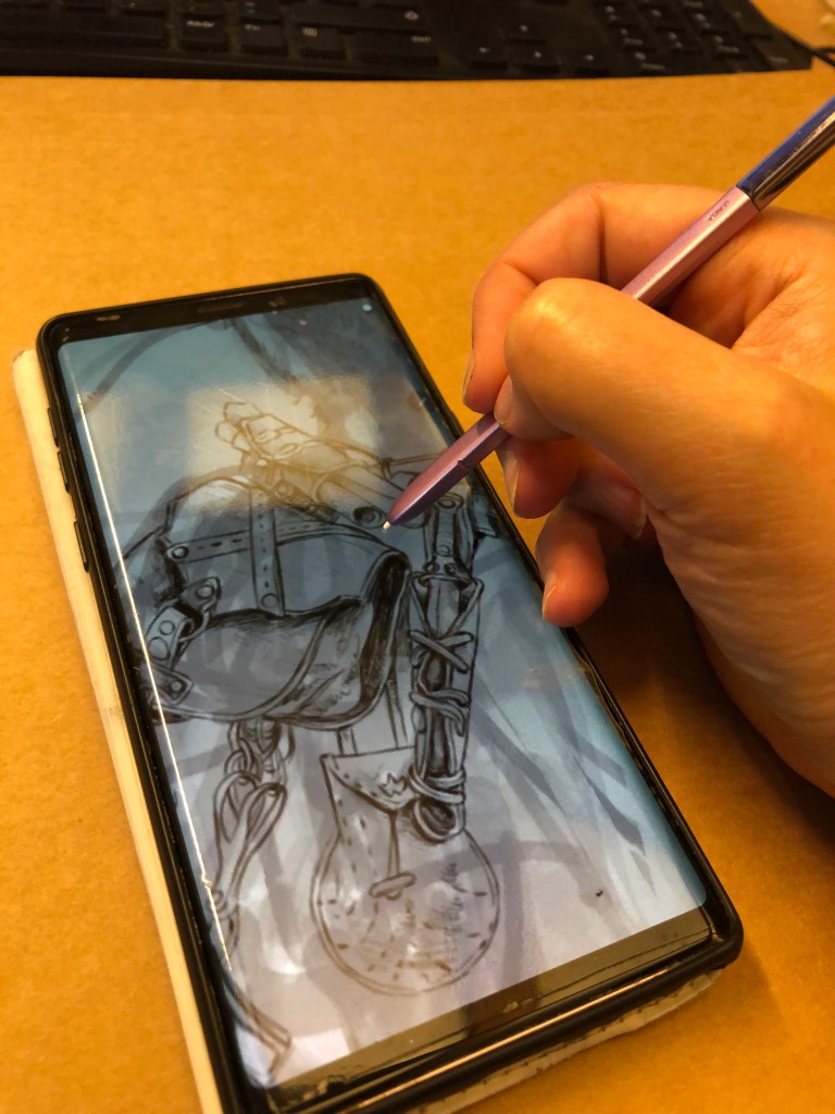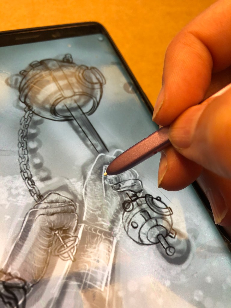 In this video, I’m working on the digital sketch of the digital painting I created for Tasslehoff Burrfoot’s Dragonlance Nexus that activates the Time Journeying Device. I drew the original sketch in pencil, scanned it, and am now “re-drawing” it using my SNote9 phone with a stylus and a drawing app. Retracing the pencil drawing is useful both for cleaning it up and for starting to add changes and details.