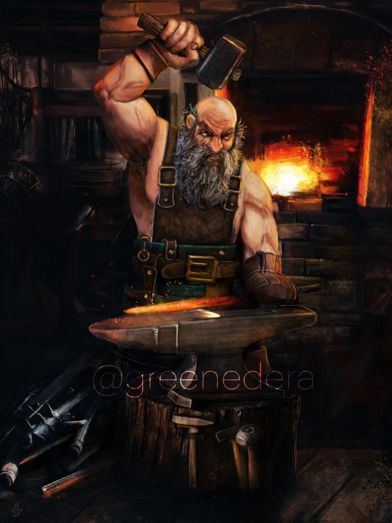 A neidar drawven smith, working metal in his forge (Dragonlance fanart).