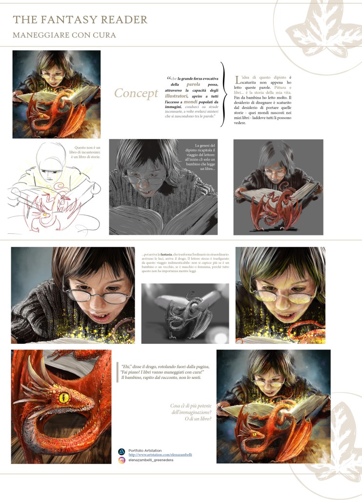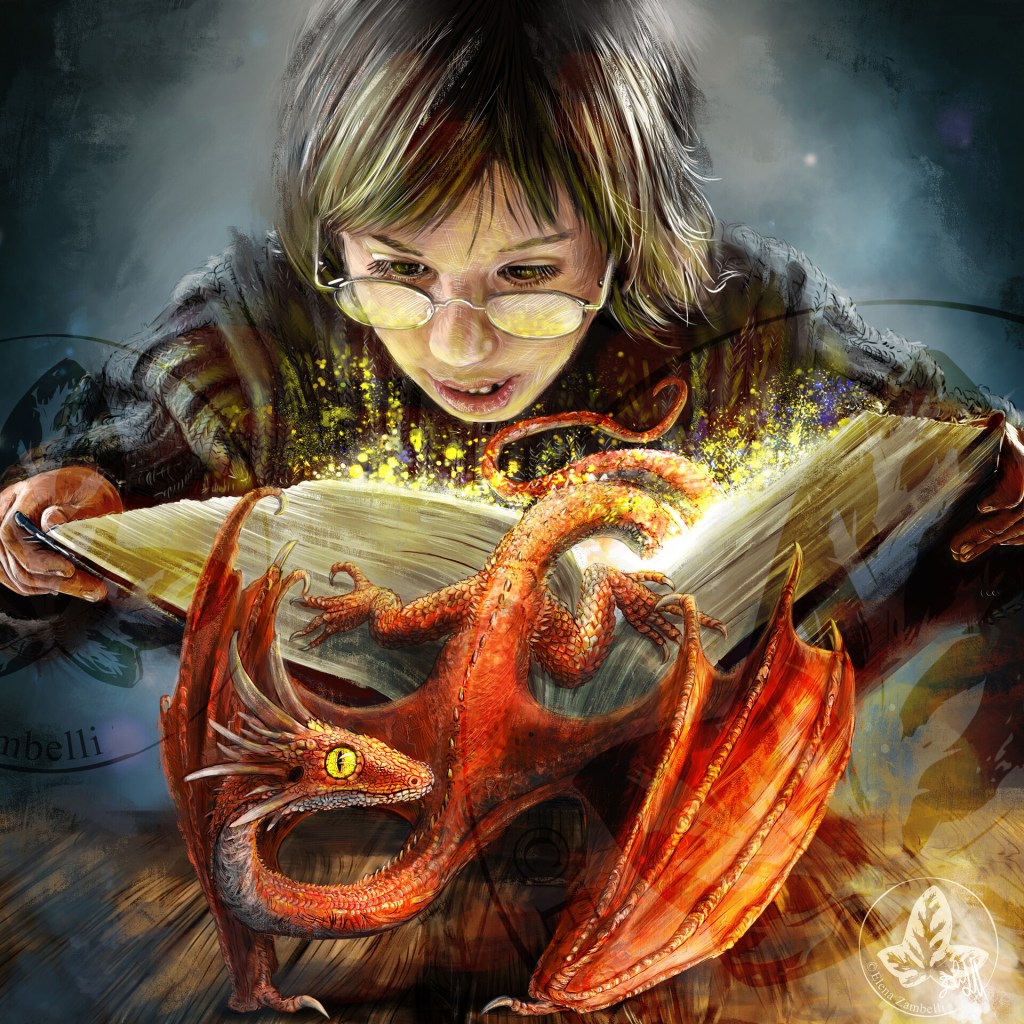 A special reference to the Dragonlance fandom. When I started this painting, I was thinking of myself and al all the young prople opening a fantasy book for the first time. The red dragon is in honor of the Dragonlance logo.