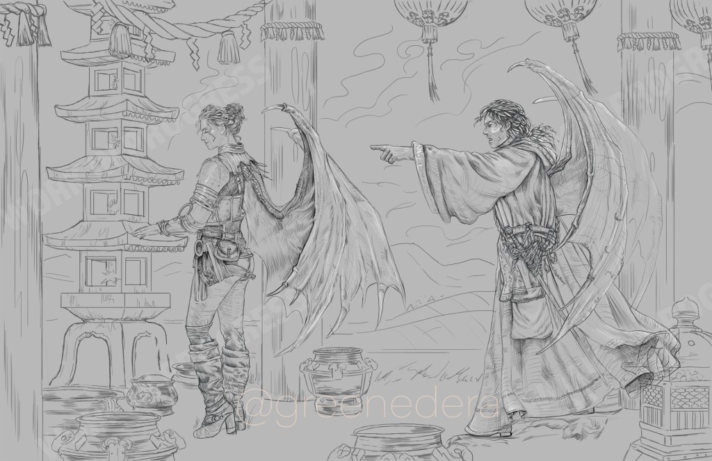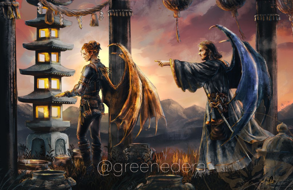 Seryne and Randyl are twins whose family roots come from Mirabar and Calimsham. In the second book, they have a discussion: Seryne is standing, caressing the tomb of her mentor (who taught her about being a samurai) while she faces her brother’s misgivings, sympathetically listening to his rants. Seryne because of honor is now marrying Kioshi… Her twin brother knows she doesn’t love him. She also just announced that she will attempt to perform the ceremony of life and death in front of their enemy to try to stop a war. – Winterhawk