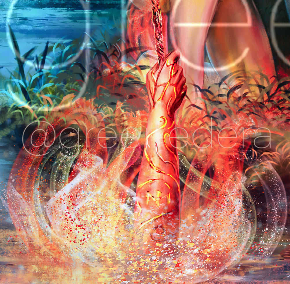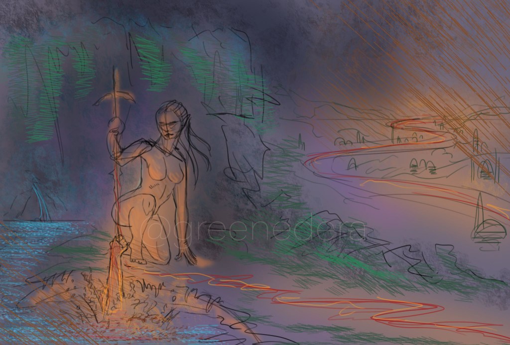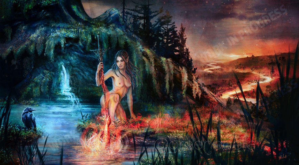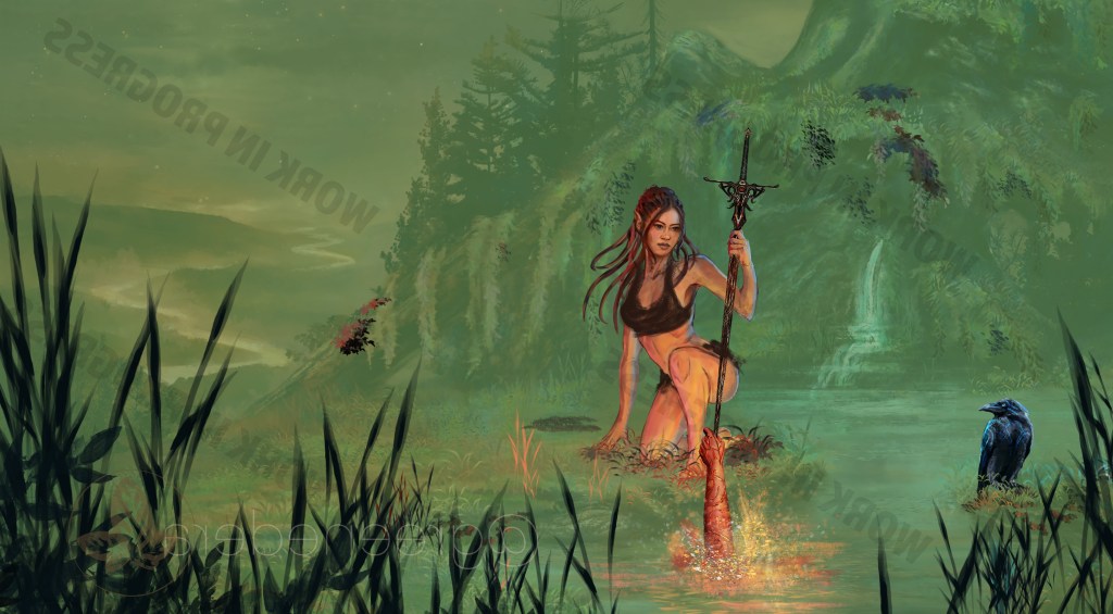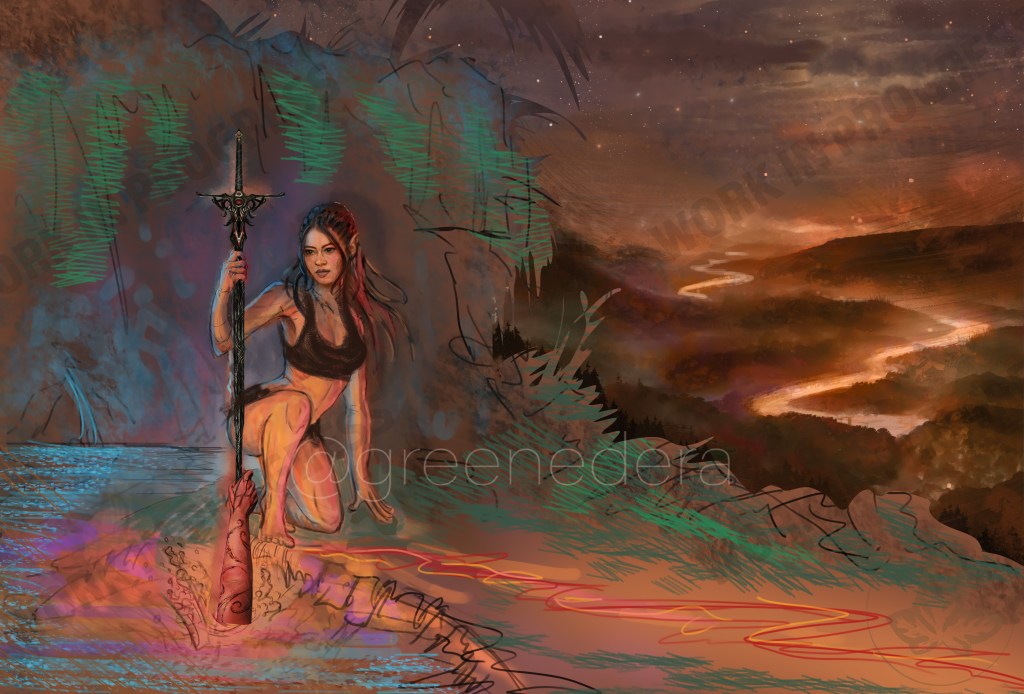 About the scene– We are on the sloping forests west of the Northern Kharolis mountains, between the Solvin River and the Wilder River. She is physically at a sacred grove of the Beast Lord (demigod) called Dark Raven, a favored companion of Habbakuk’s; it is the time of her initiation (Kentommen, rites of passage) and she is being adopted into a free tribe of Kagonesti, having recently escaped slavery in Silvanost. She sits beside a pool of water, a natural and rough sacred spring, beneath a grassy and mossy overhang in a raised hill. The Hand of Kinthalas: an elven woman’s arm, muscular and with red-skin, tattooed with black ink in the Kagonesti styles, reaches out of the water, clutching the obsidian sword blade. she grips it tight enough to draw blood. Varin’s blood flows down against Kinthalas’s; below the god’s hand, their blood flows down the blade’s length together, to the ground. It gradually becomes less like blood, and more like veins of molten lava, flowing down against the obsidian and pooling at the point where the sword point goes into the ground. Their blood mingles together in a dark version of how Arthurian myth deals with kingship and “the rightful sovereign” with the sword Excalibur; but here, Varin is made not a king, but an elevated Champion, the Chosen of Kinthalas, the sensual and violent goddess of vengeance, rather than the placid/ghostly “lady of the lake”.